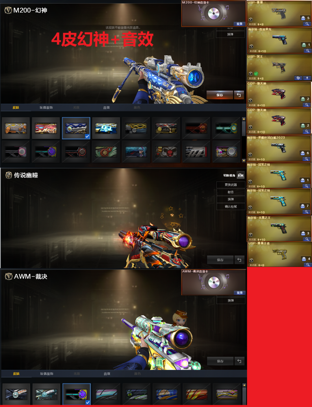 装备描述:排位:可以、、、、、、、、、、爆破四防:幻神4皮+音效(KZ、冠军之幻、2022、黄忠皮肤)、传说幽瞳、、、、、、USP雷暴、2个COP堕天神、柯尔特竞技荣光、USP冥王、23白鲨柯尔特、柯尔特-无冕之王、2个冠军之特、USP雷暴王者、白虎、QBZ冠军蔷薇、炽芒蝶刃、、、幻神音效、裁决音效、蔷薇音效、白虎音效、毁灭音效、雷神音效、、、7套堕天神、1套电竞装甲、1套幻灵、1套神工天巧、1套雷暴王者、、、爆破四防(传说艾莉莎、鹰、王者春、王者貂蝉)
