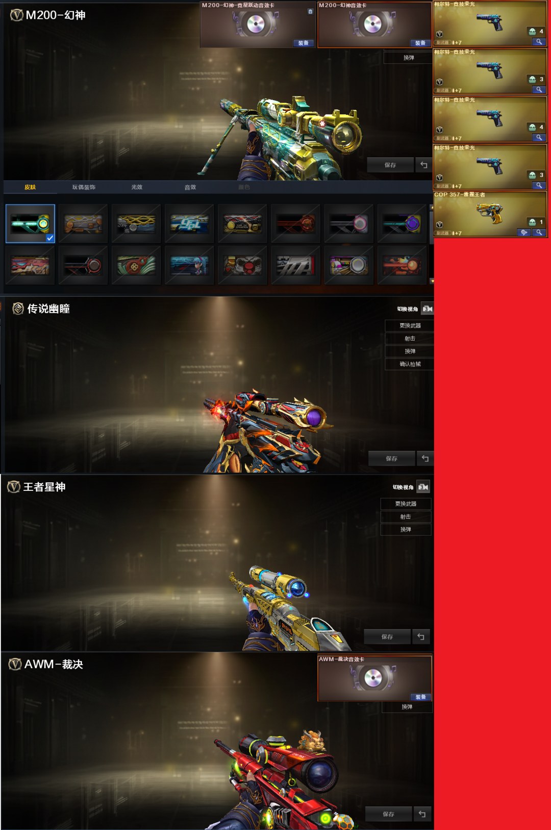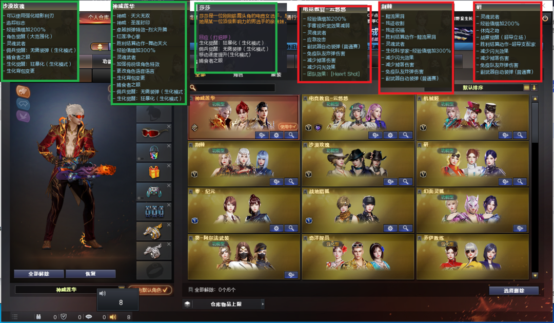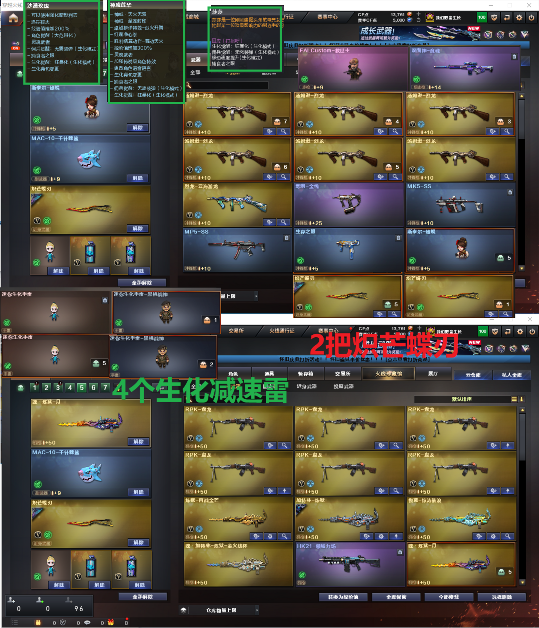 装备描述:排位:可以、、、、、、、、、生化四防(可以变更背包、查看生化僵尸血量):无需换弹、6烈龙、6盘龙、斯太尔蝴蝶、八面凌龙、救世主小人枪、双面神、死亡之眼、MAC-千针棘鲨、2把炽芒蝶刃、4个生化减速雷、超级对讲机、全部弹匣、、、、、、爆破四防:幻神音效(青鹤皮肤)、传说幽瞳、M200-竞技荣光、王者星神、、、、4个柯尔特竞技荣光、COP雷霆王者、、、、八面凌龙、九霄圣角、FAMAS G2-天戎、白虎、QBZ金色蔷薇、、、幻神音效、裁决音效、白虎音效、雷神音效、火麒麟音效、、、4套电竞装甲、3套竞技荣光、、、生化四防(神威莲华、沙漠玫瑰、莎莎)、爆破四防(云悠悠、机械姬、荆棘、研、王者迷迭香、王者惊若翩鸿)