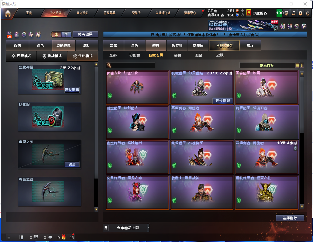 生化炽芒蝶刃♉时空猎手♉16个生化皮肤♉毒蜂斯泰尔生存死亡♉兔囡囡生化属性♉满榴弹不退包♉无6盘6烈