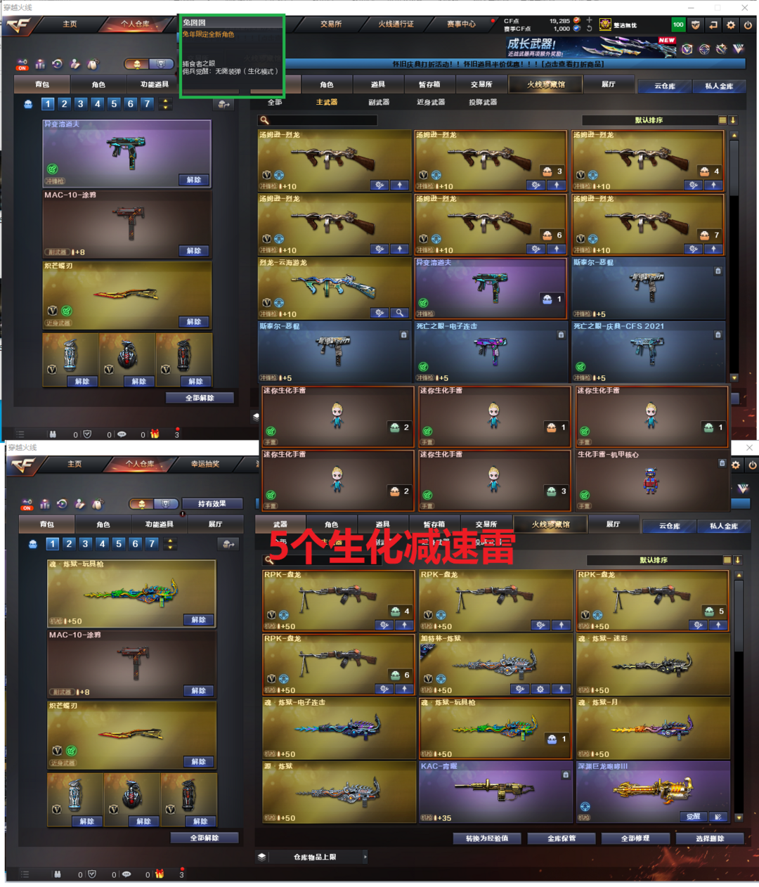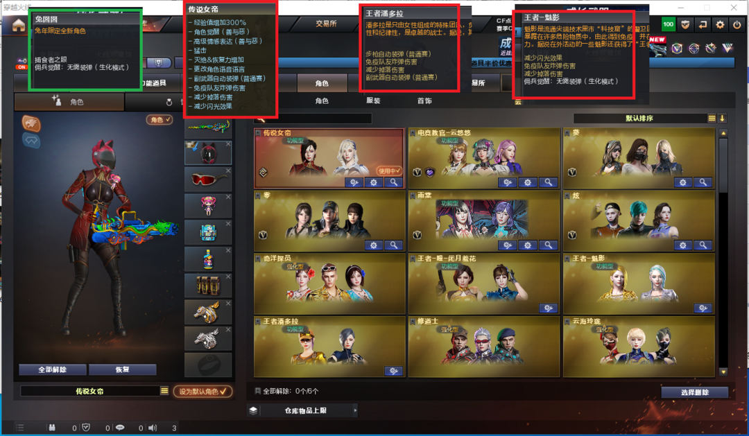装备描述:排位:可以----------------生化全装(查看僵尸血量):无需换弹、6烈、4盘龙、炼狱、异变清道夫、死亡之眼、MAC-涂鸦、炽芒蝶刃、手斧镜、5个生化减速手雷、超级对讲机、、、、、、、、、、、、爆破四防:幻神竞技荣光、传说灵眸、98K星神、传说破晓、USP雷暴、柯尔特竞技荣光、2个世冠柯尔特、2个COP雷霆王者、传说光耀(9457序列号)传说暗裔、白虎、QBZ金色蔷薇、、、白虎音效、毁灭音效、雷神音效、火麒麟音效、、、1套夜魔、4套竞技荣光、5套雷霆王者、、、生化人物(兔囡囡)、爆破四防(传说女帝、云悠悠、王者潘多拉、王者魅影)