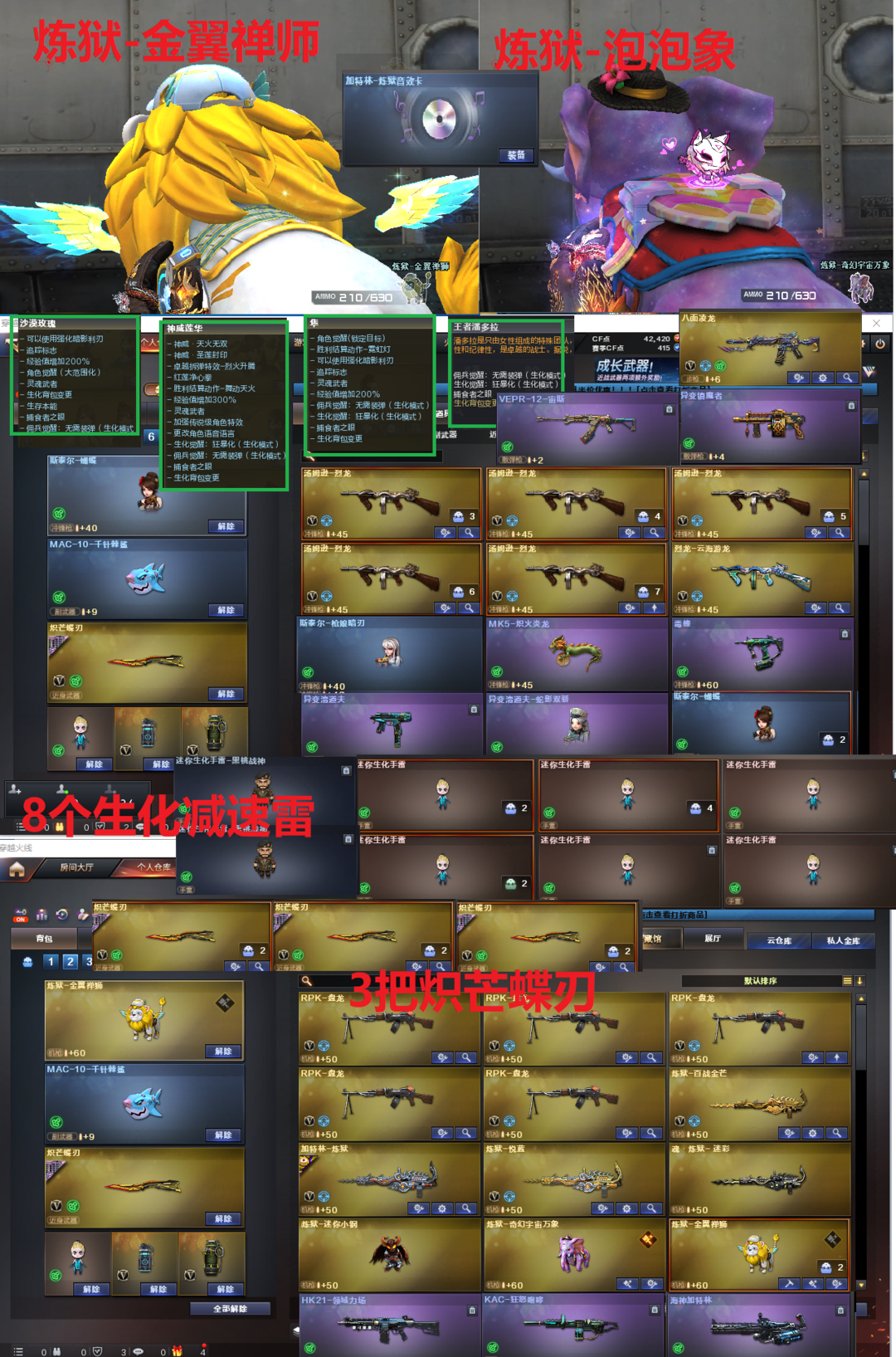 装备描述:排位:可以-----------双清道夫=无限卡子弹、、、、、、生化四防极品(变更背包、看僵尸血量):无需换弹、6烈5盘、3炼狱、炼狱-金翼禅师、炼狱-泡泡象、八面凌龙、斯泰尔蝴蝶、斯太尔枪娘暗刃、VPER-12宙斯、毒蜂、清道夫、清道夫-小人枪、异变镇魔者、炽火炎龙、、KAC狂怒咆哮、领域力场、双面神、MAC龙宝、MAC千针棘鲨、3把炽芒蝶刃、8个减速雷、全部弹匣、、、、、、、爆破四防:幻神9皮+音效(KZ、EP荣耀、24AG、宠儿、冠军之幻、丹凤、周瑜、电流骇客、黄忠)M200-竞技荣光、王者星神、、、、传说幽冥、USP雷暴、COP幻灵、柯尔特竞技荣光、2个USP冥王、23白鲨柯尔特、EP荣耀柯尔特、冠军之特、、、G36幻影、神威天绫、传说暗裔、天戎、白虎、QBZ金色蔷薇、、、幻神音效、裁决音效、幻影音效、白虎音效、毁灭音效、雷神音效、、、4套雷暴、8套电竞装甲、1套幻灵、3套竞技荣光、1套神工天巧、3套量子之心、1套雷霆王者、1套王者之魄、、、生化四防(神威莲华、沙漠玫瑰、隼、王者潘多拉)、爆破四防(传说星骇、妮妮、等等)