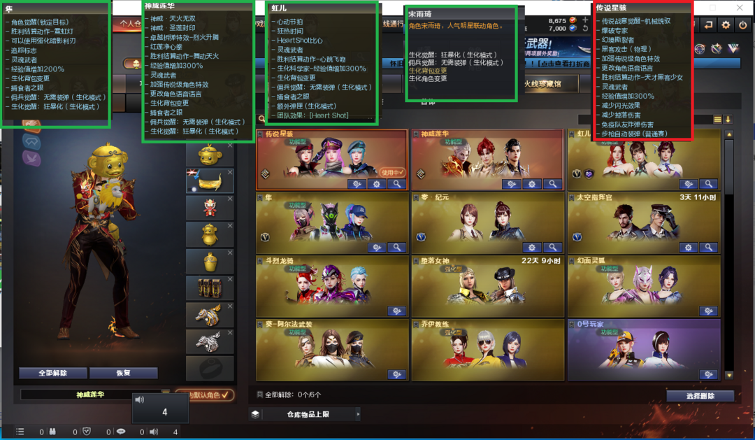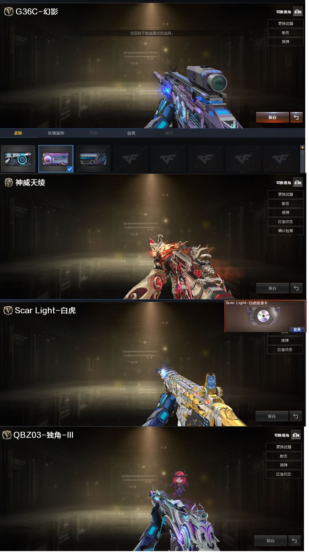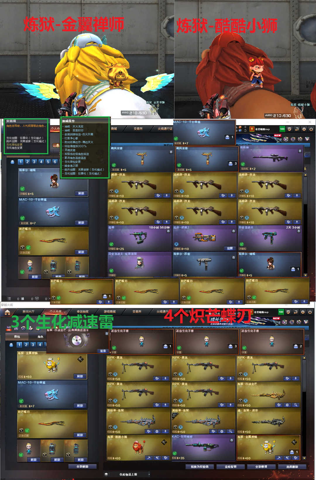 装备描述:排位:可以、、、、、、、生化四防极品全装(可以变更背包、查看生化僵尸血量):无需换弹、炼狱-金翼禅师、炼狱-酷酷小狮、6烈龙、5盘龙、3炼狱、斯太尔蝴蝶、异变清道夫-小人枪、炼狱小刚、双面神、死亡之眼、KAC-狂怒咆哮、MAC-千针棘鲨、两把飓风双雄、MAC-涂鸦、4把炽芒蝶刃、手斧镜、3生化减速手雷、超级对讲机、全部弹匣、、、、、、、、、、、、、爆破四防:G36幻影、神威天绫、白虎、白虎玄豹、QBZ金色蔷薇、、、毁灭音效、白虎音效、玄武音效、炼狱音效、、、1套雷霆、1套王者堕天神、、、生化四防(神威莲华、宋雨琦、隼、虹儿)、爆破四防(传说星骇)