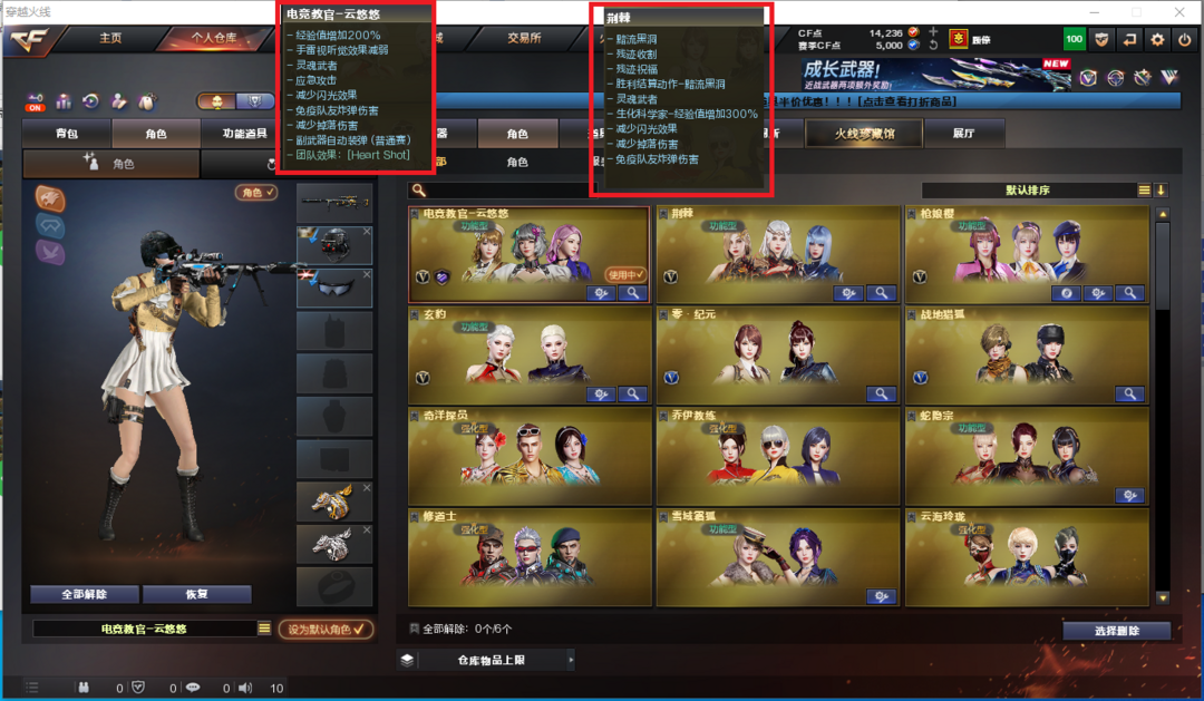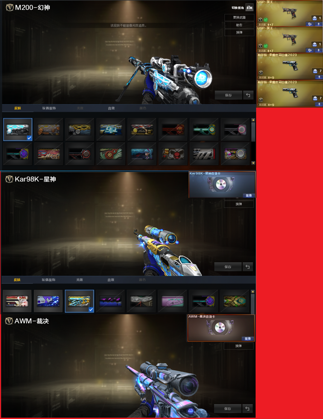 装备描述:排位:可以、、、、、、、爆破四防:幻神(23白鲨皮肤)、M200-竞技荣光、98K星神、、、、、2个USP冥王、2个23白鲨柯尔特、FAMAS G2-天戎、白虎-九尾狐、王者玄武、、、裁决音效、星神音效、雷神音效、、、2套竞技荣光、5套玄豹、、、爆破四防(云悠悠、荆棘、枪娘樱、玄豹)