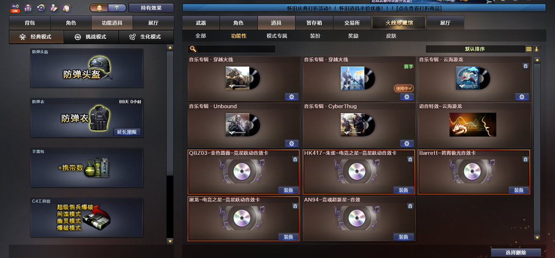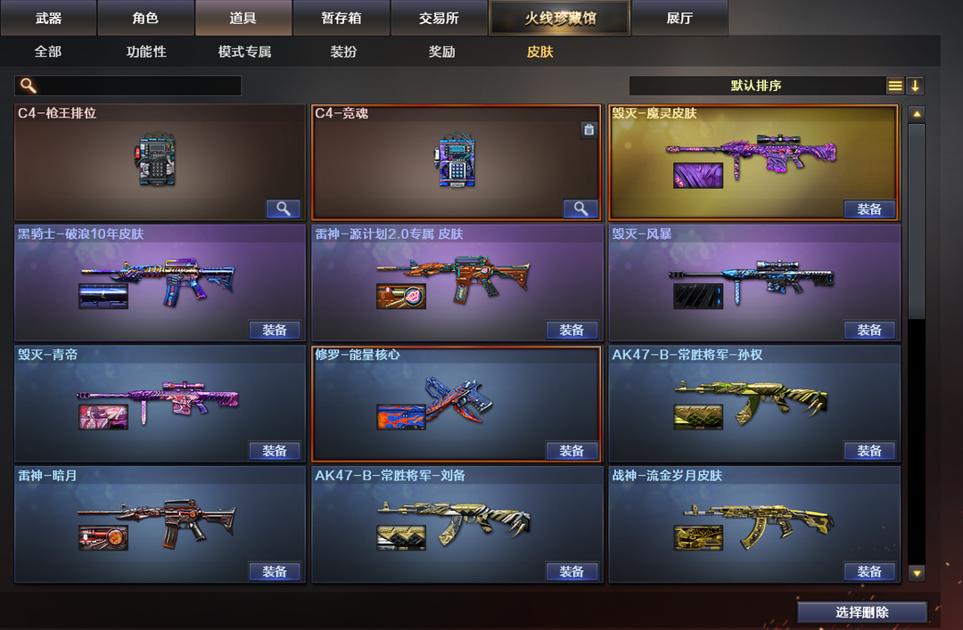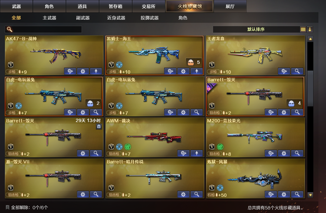 装备描述:王者武器:王者龙血-觉醒版;王者之锋-觉醒版 英雄武器:Barrett-毁灭;AWM-裁决;白虎-电玩蓝兔;Barrett-碧霄极光;机械迷城-穹宇;M4A1-雷神;超新星-热带奇洋;龙啸-热带奇洋;手雷-热带奇洋;烟雾弹-云龙;高爆手雷-云龙;汤姆逊-烈龙;黑武士-锦绣游龙;炽芒蝶刃;传说破晓;黑骑士-海王;沙鹰-修罗;手雷-云海游龙;烈龙-云海游龙;擎天-云海游龙;龙啸-烈火龙威;烈火-动感闪耀;天神-动感闪耀;屠龙-动感闪耀;手雷-动感闪耀;无影-神兵利器;AK47-火麒麟;AK47-B-战神;Barrett-暗月传说;QBZ03-金色蔷薇;Barrett-毁灭;USP-雷暴;柯尔特-竞技荣光;M200-竞技荣光;烟雾弹-竞技荣光;高爆手雷-竞技荣光;闪光弹-竞技荣光;擎天-竞技荣光;烟雾弹-夜魔;高爆手雷-夜魔;闪光弹-夜魔;破空枪刃-夜魔;马来剑-夜魔;炼狱-风暴