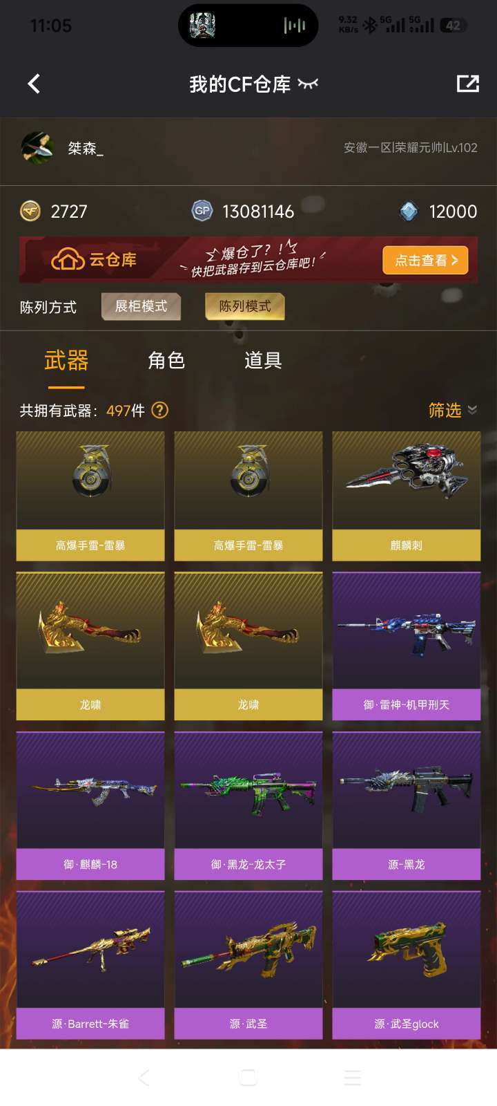装备描述:王者之光、王者之心、王者之翼、王者之翼觉醒版、王者之锋、王者风神-觉醒版、炫金天龙X2、炫金毁灭X2、炫金雷神、AA12雷霆、AK12-天启、AK47-无影、AK47-火麒麟、AK47雷暴、AK47黑鲨、AN94超新星X2、AWM天龙、巴雷特极光X2、巴雷特毁灭X2、G36C幻影、M200幻神、M4A1千变X2、M4A1玫瑰精灵X2、M4A1雷神X2、M4A1青龙、M4A1黑骑士、M4A1黑龙、QBZ03金色蔷薇、USP雷暴、加特林炼狱、屠龙X2、幻灵之锋、擎天X3、斩神刀雷暴、汤姆逊烈龙X2、沙鹰修罗X5、沙鹰天神X3、烟雾弹幻灵、烟雾弹雷暴X5、闪光弹雷暴X5、高爆手雷雷暴X5、麒麟刺、龙啸X2、御·雷神-机甲刑天、御·麒麟-18、御·黑龙-龙太子、源-黑龙、源·Barrett-朱雀、源·武圣、源·武圣glock、源·猎神、火麒麟-小电视、火麒麟-能量核心、魂-雷神-萌杀、魂·修罗-娜塔莉娅、魂·修罗-神兵利器、魂·雷神-新春神龙、魂·黑骑士-娜塔莉娅、葵