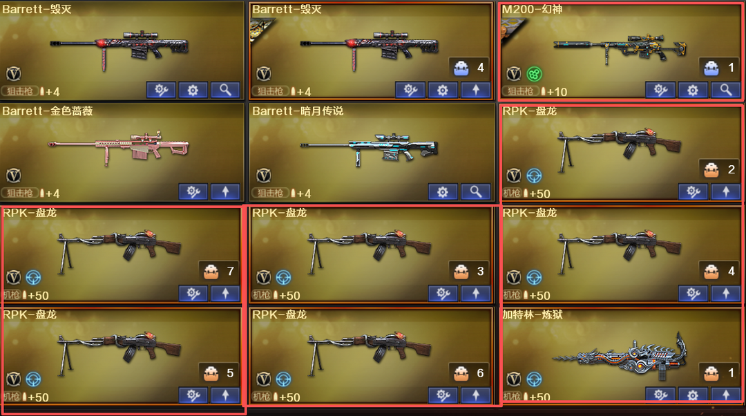 装备描述:火麒麟音效卡。雷神音效卡。毁灭音效卡,RPK-盘龙;汤姆逊-烈龙;屠龙;HK417-朱雀;Scar Light-白虎;USP-雷暴;高爆手雷-雷暴;烟雾弹-雷暴;闪光弹-雷暴;斩神刀-雷暴;M200-幻神;龙啸;M4A1-龙血;AK12-天启;QBZ03-金色蔷薇;加特林-炼狱;9A91-烈火;AN94-超新星;M4A1-死神;沙鹰-修罗;M4A1-黑龙;M4A1-武圣;M4A1-千变;AWM-天龙;沙鹰-天神;AK47-火麒麟;擎天;M4A1-雷神;麒麟刺;M4A1-玫瑰精灵