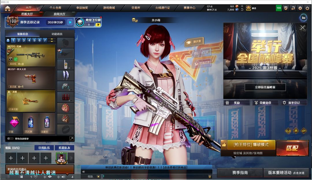 装备描述:英雄武器:Barrett-毁灭;屠龙;QBZ03-金色蔷薇;M4A1-雷神;Barrett-毁灭;M200-幻神;AK47-火麒麟;AK-47-猩红传说;白虎-电玩蓝兔;AK47-B-常胜将军;Barrett-暗月传说;M4A1-黑骑士 角色:关小雨;猎狐者;刀锋;曼陀罗;幻影;复仇者;堕天使;灵狐者;蜀雪;剑齿虎;暗夜-X;北极狐-X;陈龙野-Z;妲己;娟娟;甜心偶像;麻雀;剑齿虎-X;圣诞潘多拉-X;潘多拉-甜心教官;芳心审判者;社长刀锋;兔囡囡;嘉年华灵狐 道具:生化弹匣;冲锋枪弹匣;步枪弹匣;超级背包;忧郁雪人帽;黑色枪口火焰;防弹衣;炫彩背包-诺拉;防弹头盔;防化服;C4工具钳;手雷包;绿色巨人;灵魂忍者;迷雾幽灵;疯狂宝贝;防弹衣;彩蝶之翼;夺命之镰;防化服;天使之翼;防弹头盔;C4工具钳;手雷包;防弹衣;小萝莉;京剧背包;天使之翼;防弹头盔;C4工具钳;手雷包;防弹衣;M4A1-黑骑士音效卡