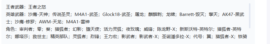 王者武器:王者之怒,M4A1-武圣;AK47-黑武士;屠龙;龙啸;麒麟刺;AWM-天龙;Barret