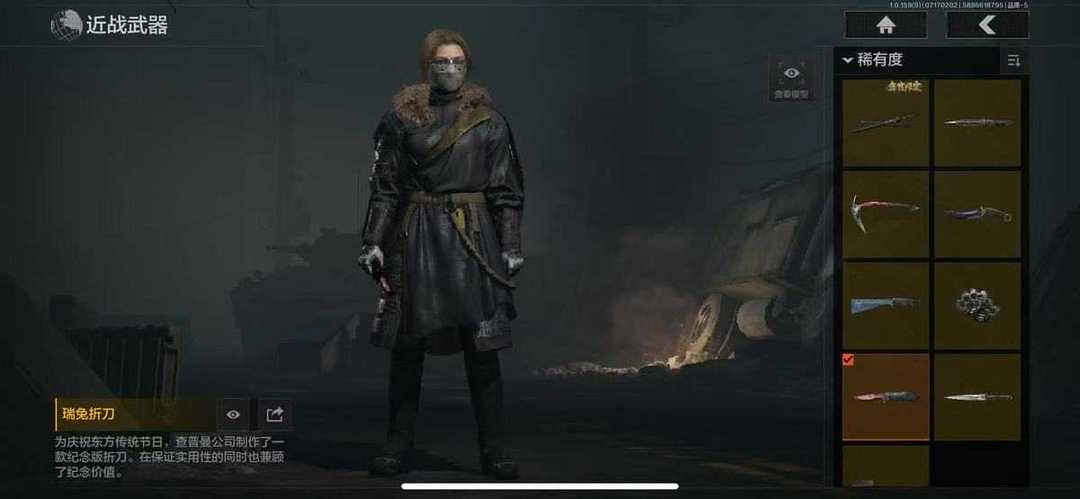 装备描述:暗区宇1127:八个刀,指虎,胜利军刀,急袭弯刀,冰镐,霜狼生存刀,突击匕首,三尺万刃,瑞兔折刀 都市铁衣战术甲胄 噤声者吉利服