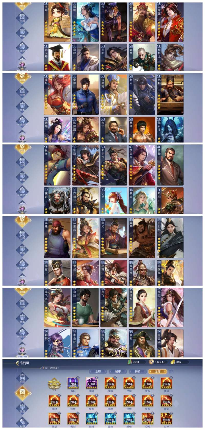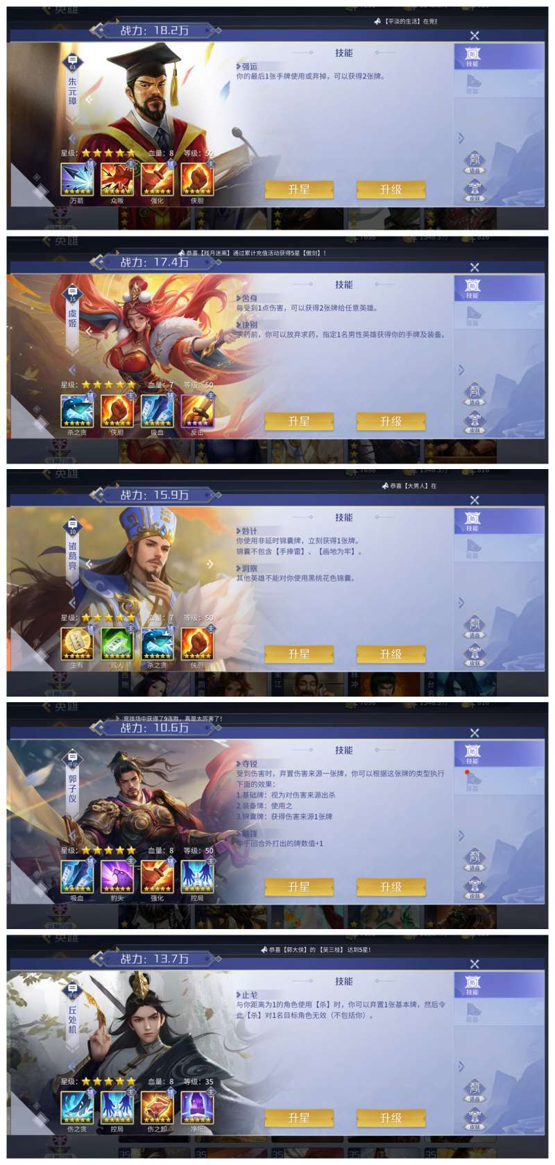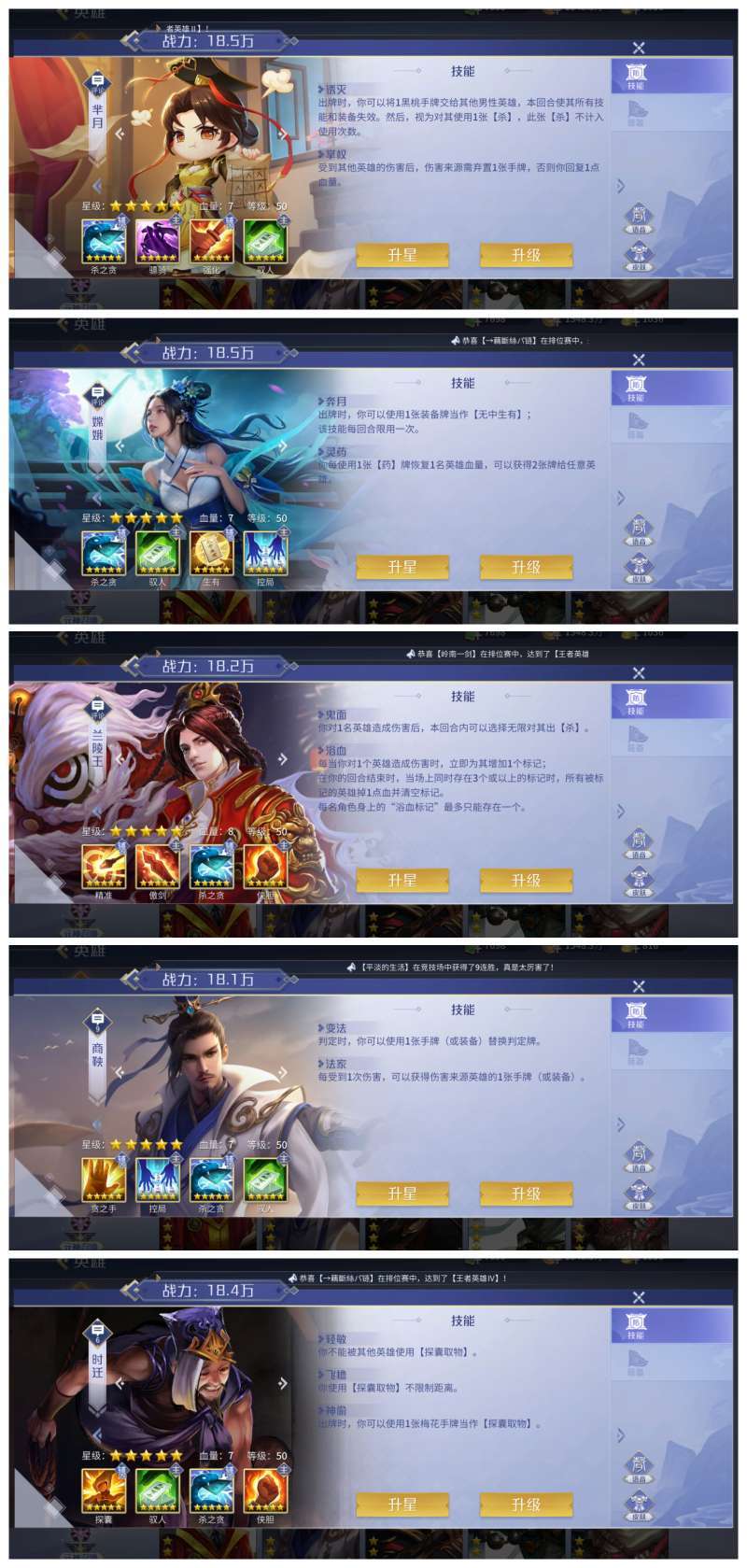 五星郭子仪 骠骑芈月 净谭丘处机 嫦娥 包子 商偷鸡浪兰等