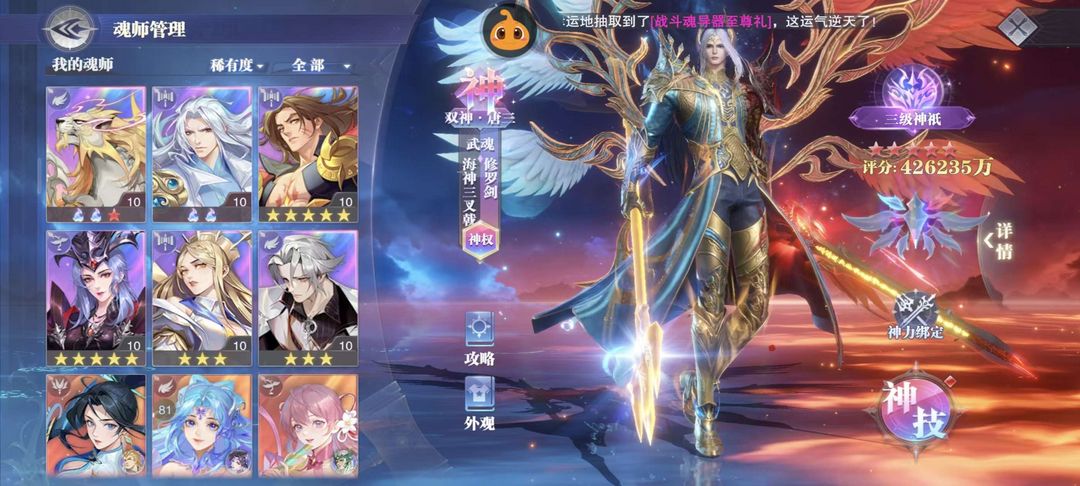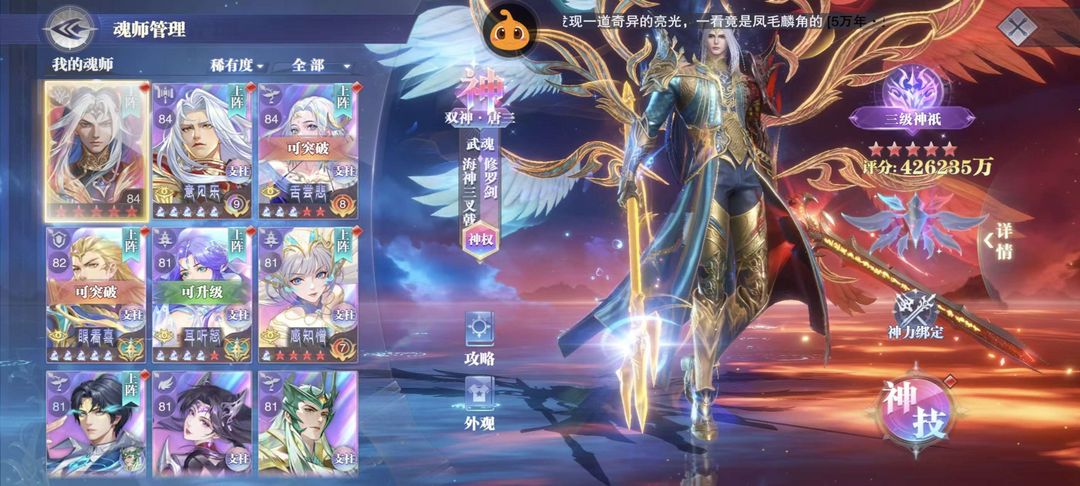 装备描述:168亿,强力魂师都有(王林,修三,李慕婉)可自由搭配阵容,回归玩家。