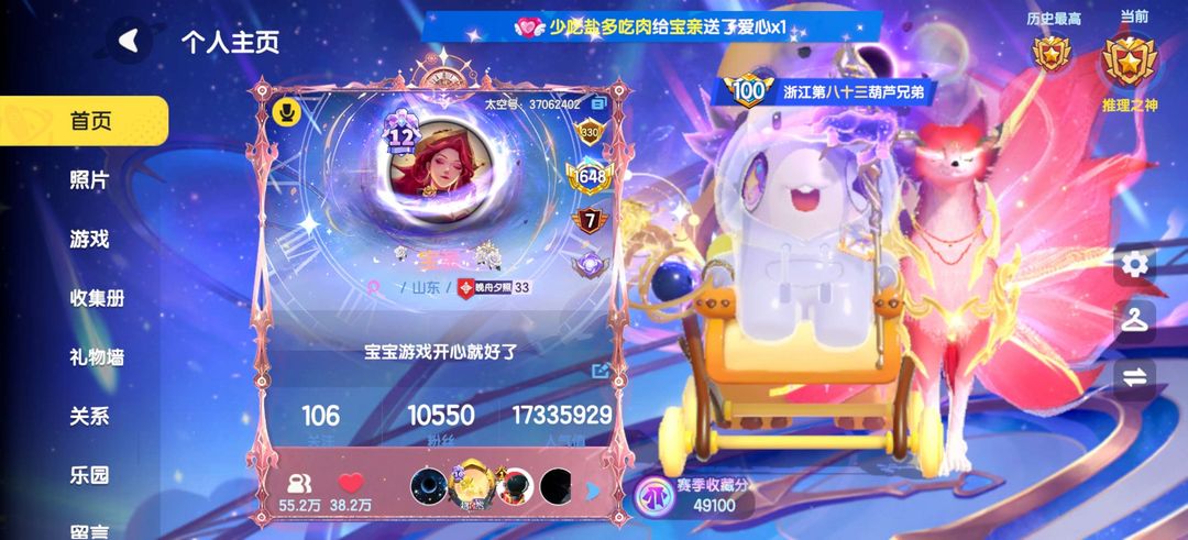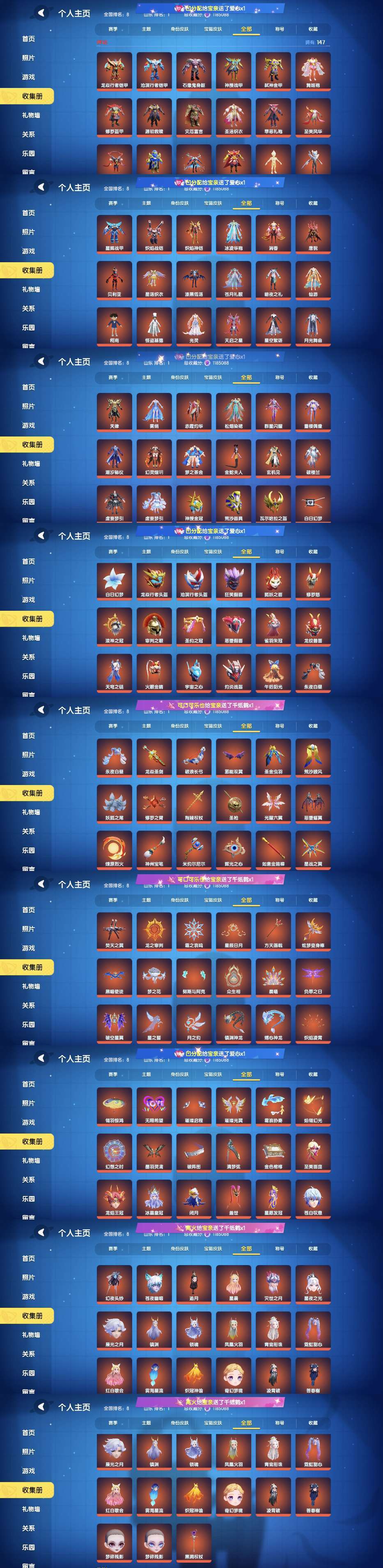装备描述:东西基本齐了,最新熊出没全套已秒 三个专属称号暗影主宰 雪域之巅 云顶之巅 s1.2.3.4.5.6.7.8.9.11.12,ss1.2.3.4.5.6.7.8.9.10赛季全集齐。神话皮肤差四套全满,身份皮肤差一个全,传说皮肤也基本齐了,8个三个币的坐骑,50w氪度