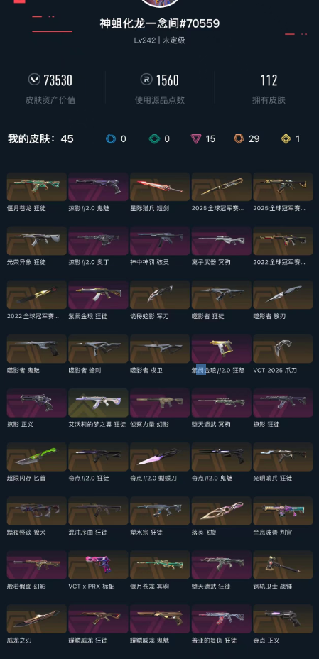 装备描述:8W库存可排位+冠军+塑水宗+奇点+吞影者+弃王+光荣+威龙+侦查+VCT
