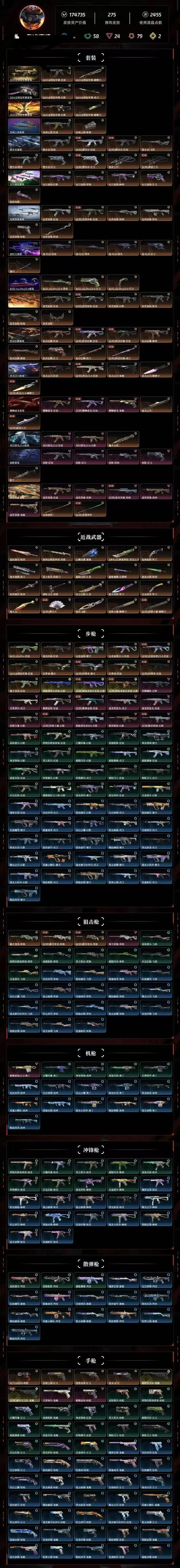 Lv308 ,皮肤总价值174735,未定级,总皮肤275,刀皮34枪皮241(终极2传奇45卓越