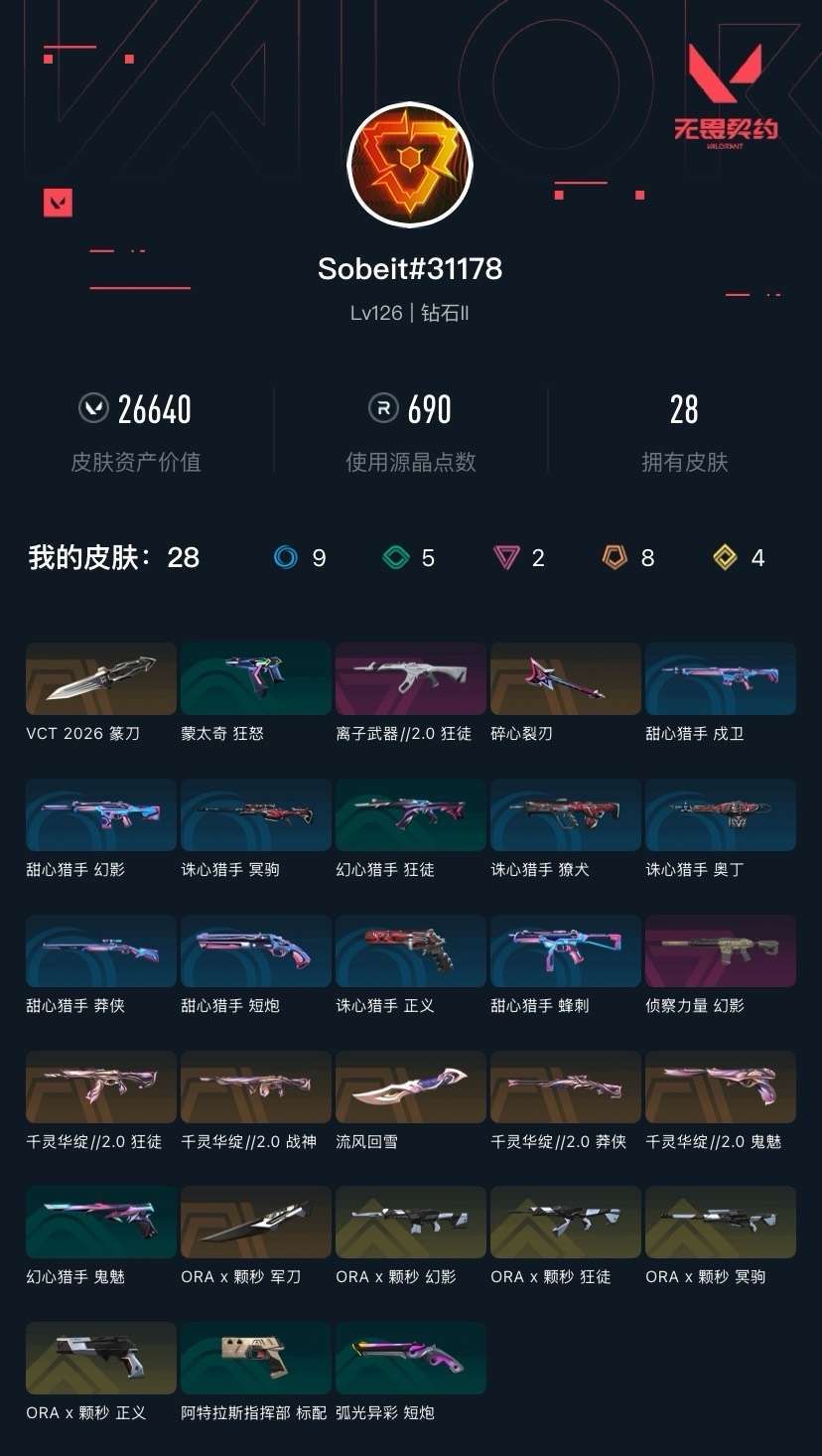 段位:钻 石II可排位 vct26篆刀★ROA颗秒全套★莲花2.0全套★离子狂徒 侦查幻影