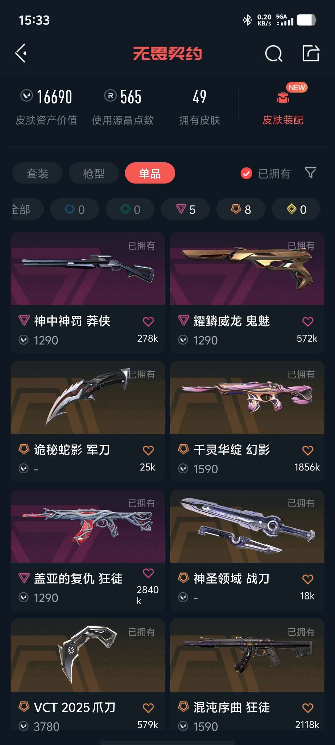 装备描述:VCT爪刀 狂徒:混沌,盖亚,日冕雄狮 莲花幻影 塑水宗正义 离子大狙 耀麟威龙鬼魅 奇点战神 神中神盲侠