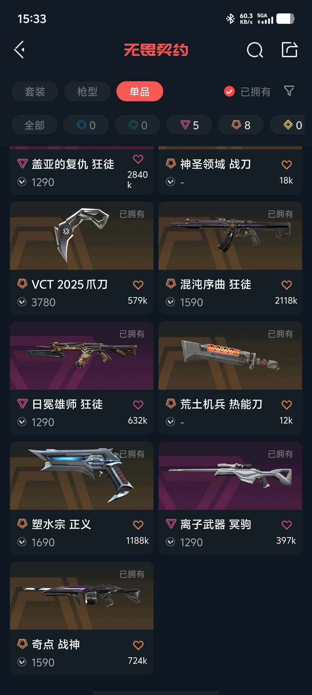 VCT爪刀狂徒:混沌,盖亚,日冕雄狮莲花幻影塑水宗正义离子大狙耀麟威龙鬼魅奇点战神神中神盲侠