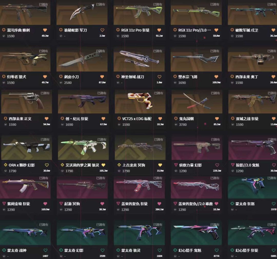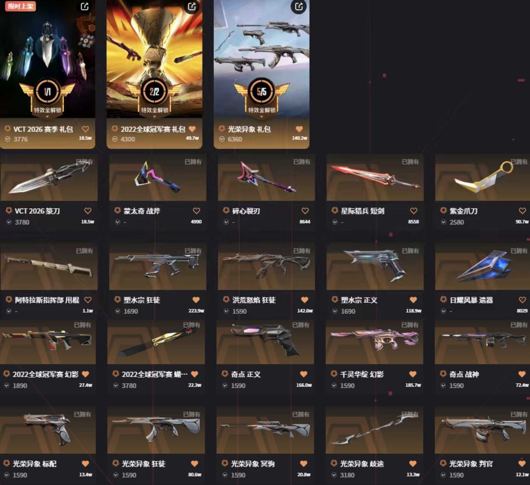 10万库vct篆刀光荣套22冠军套✨流脓塑水盖亚紫金显卡双城ak✨莲花侦察颗秒m4✨奇点正义