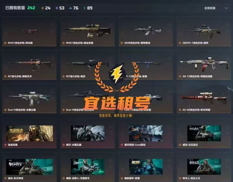 皮肤号 无币极品皮肤号⚡4红噬金水墨天际女医影锋全套43金⚡战斗部门6+6⚡3典藏极品枪皮气象王牌美杜莎