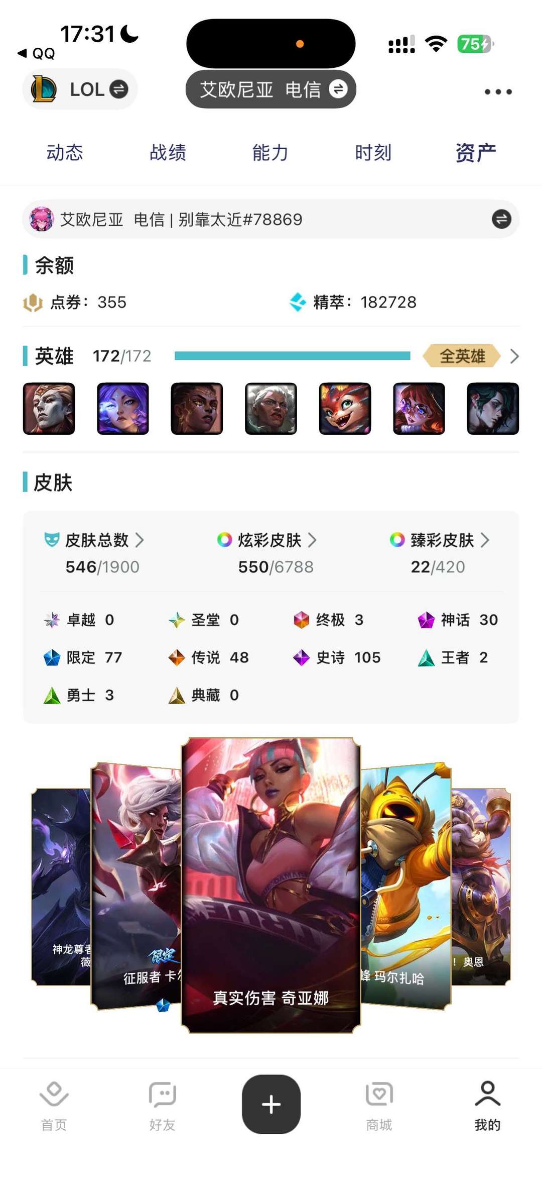 LOL超绝妹子号艾欧尼亚全英雄单双钻2随便加好友可玩任意模式