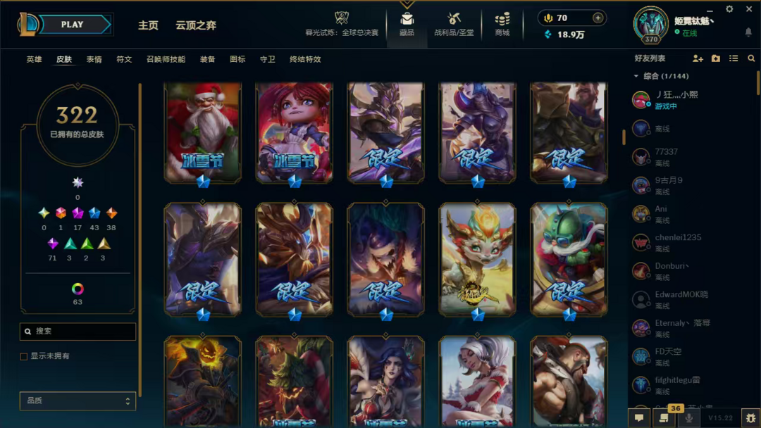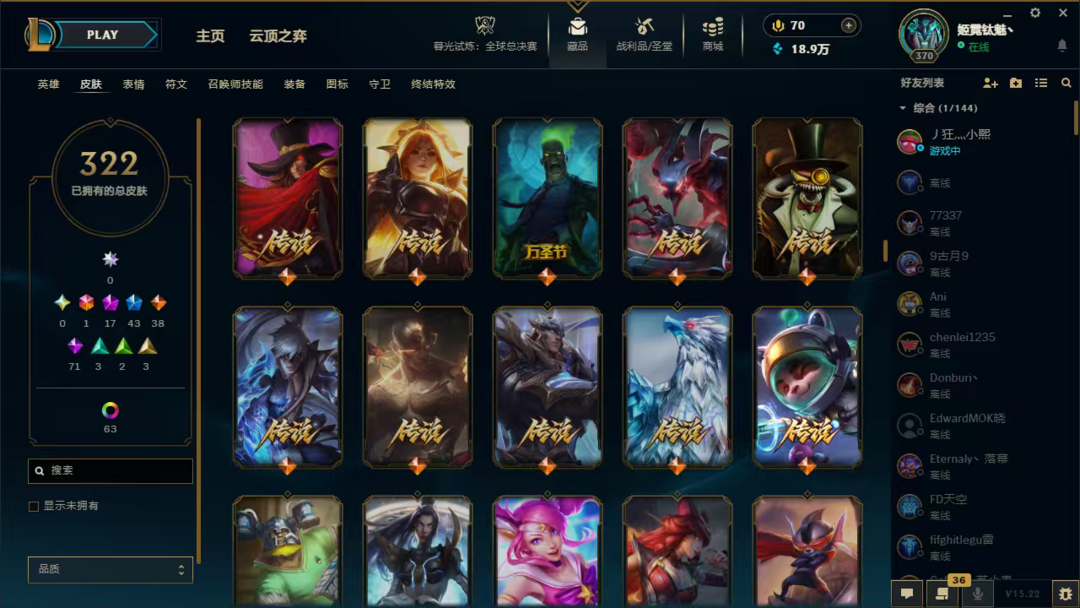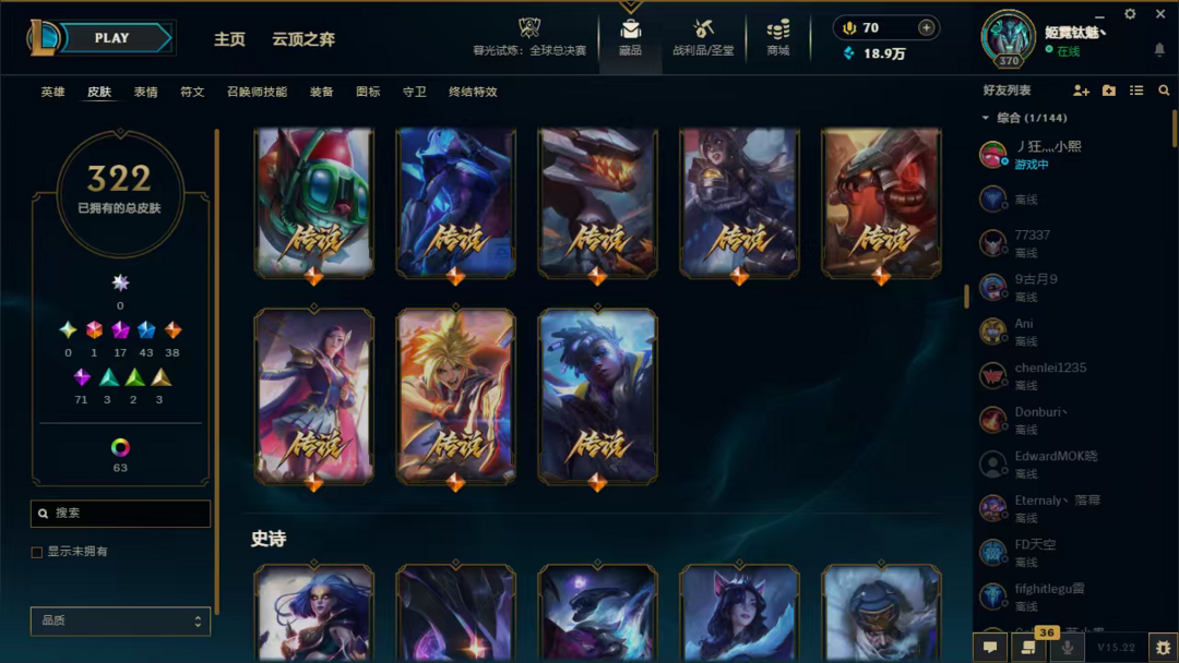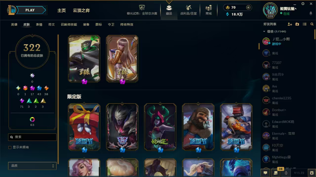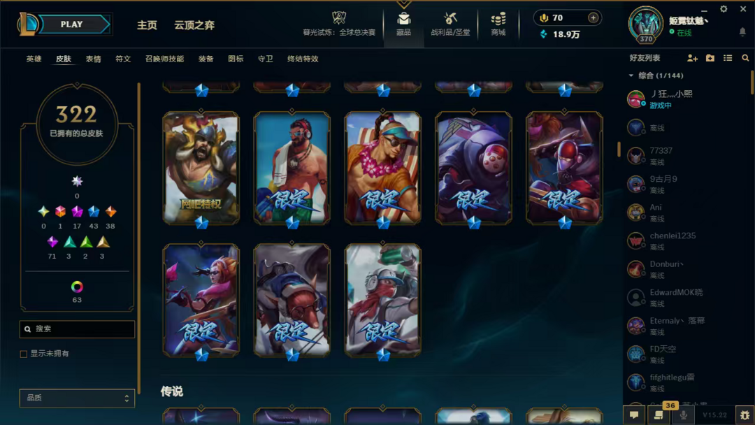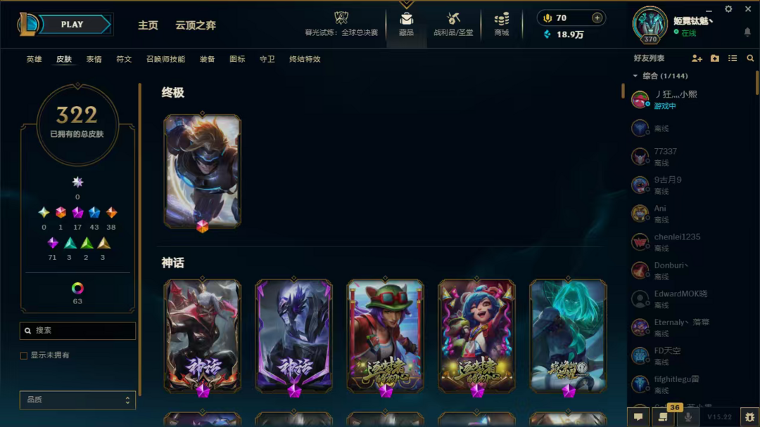 诺克萨斯可排位-三百多皮肤号-17神话至臻皮肤-38传说手感皮肤-43限定皮肤。