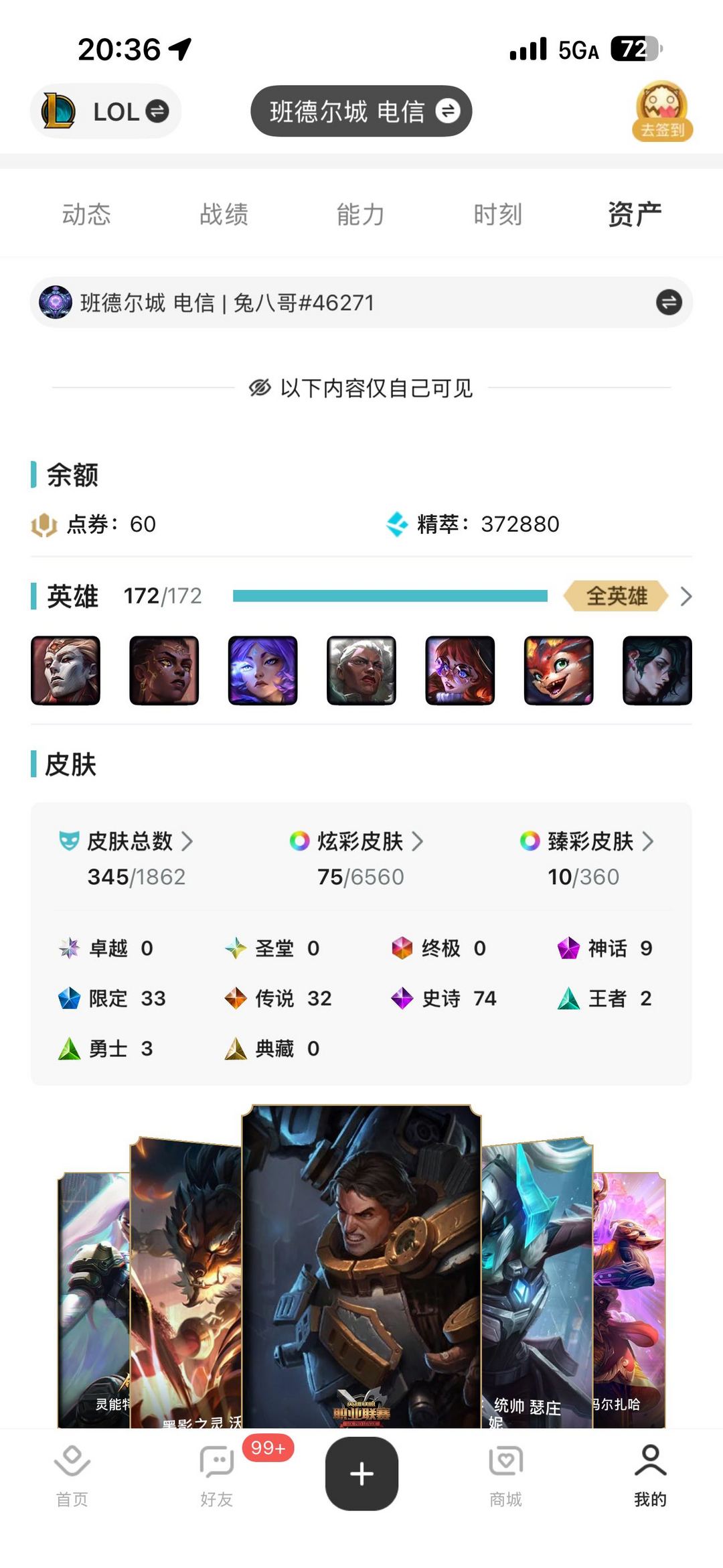 装备描述:英雄170➕ 皮肤300➕,登入器上号喜欢本账号请点 ☆收藏☆ 方便下次租用,谢谢光临惠顾!