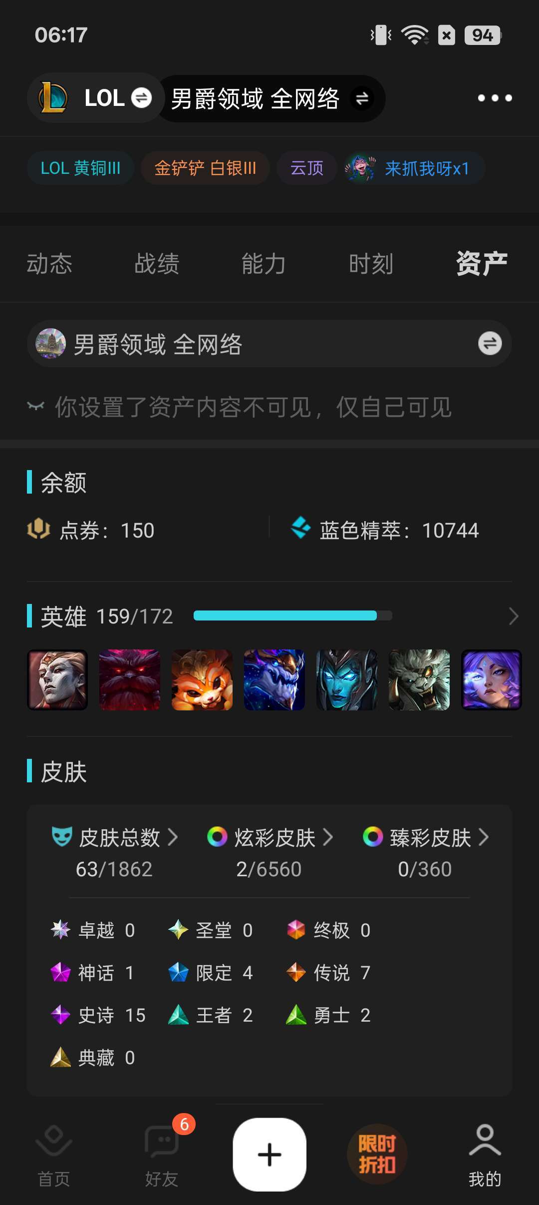 装备描述:开黑,排位,带妹,黑铁白银炸鱼号,亚索瞎子皮肤等,40多皮肤,全英雄