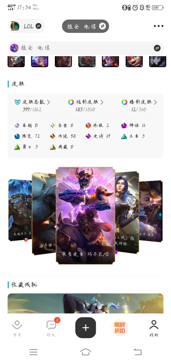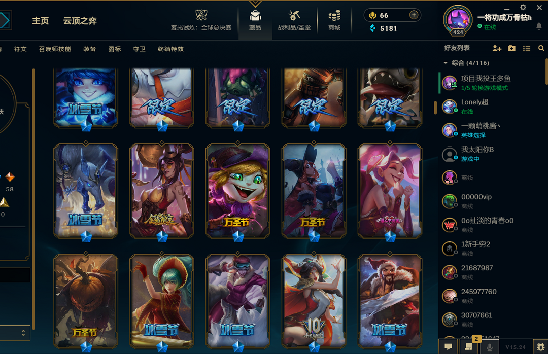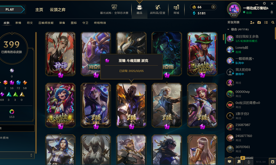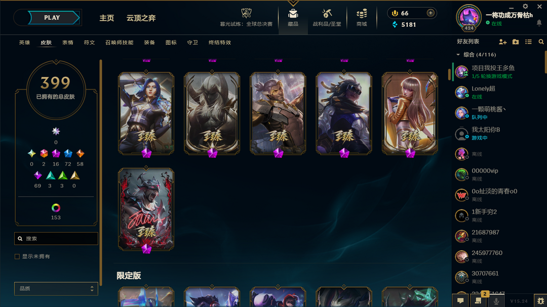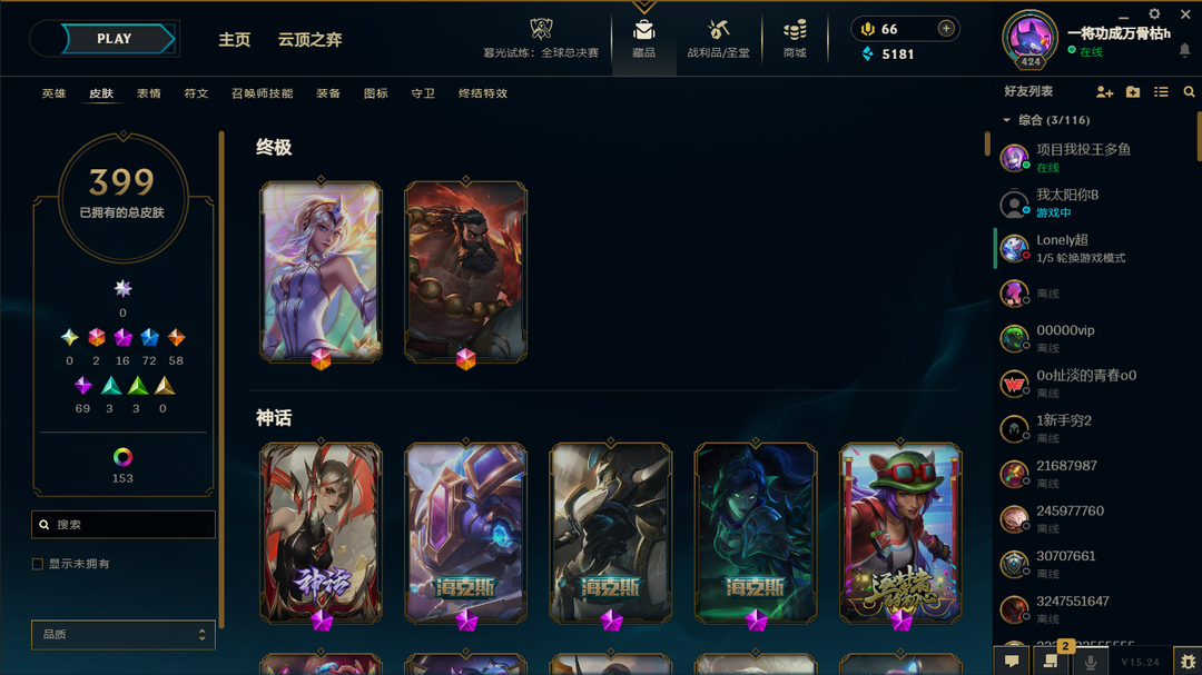 594p!399原皮,195炫彩(包含12臻彩),全英雄,ADC皮肤居多,喜欢下路的可以来!
