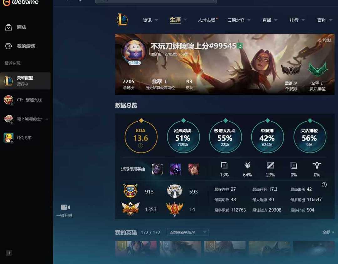 全英雄 93 皮❤️600 场 42 胜率❤️极品负胜率黑铁 4 真实段位可排位❤️