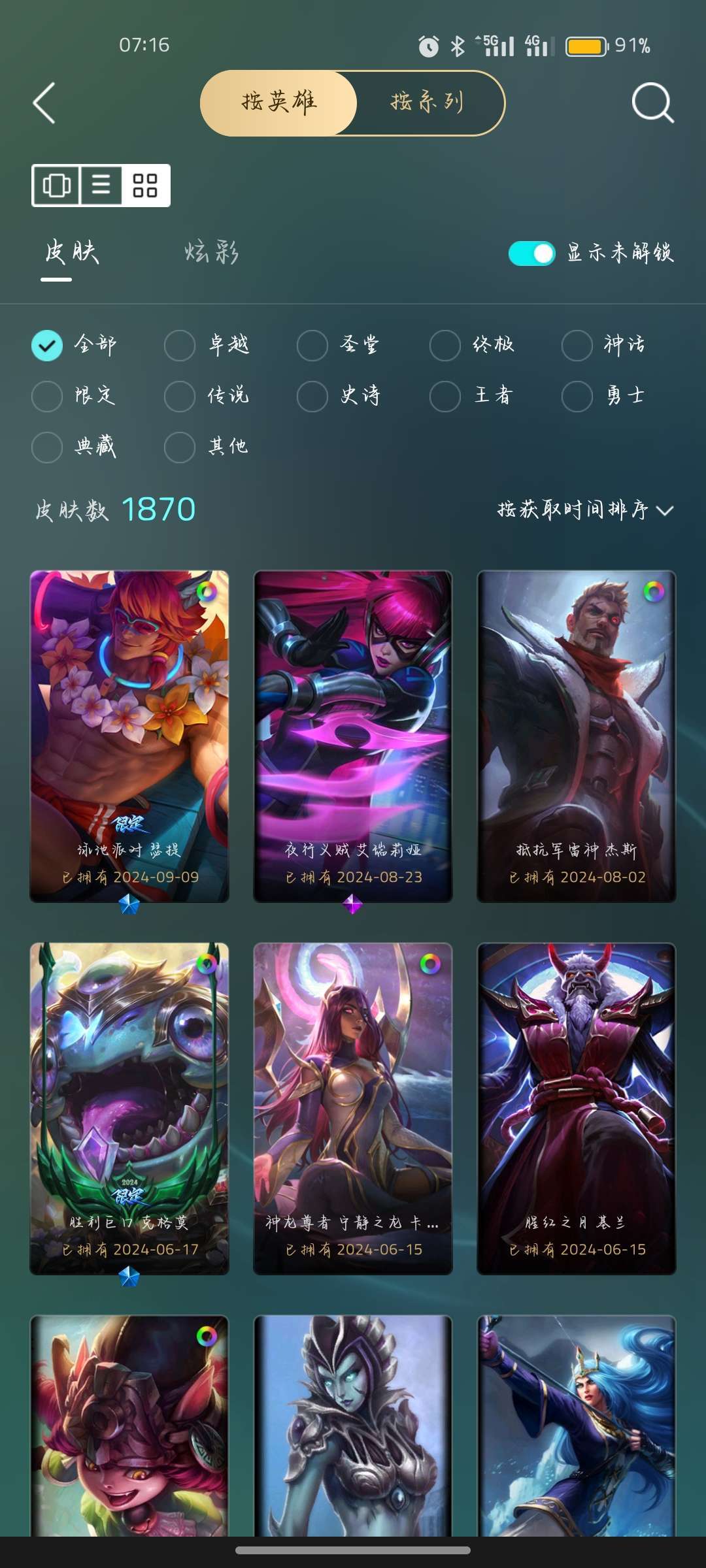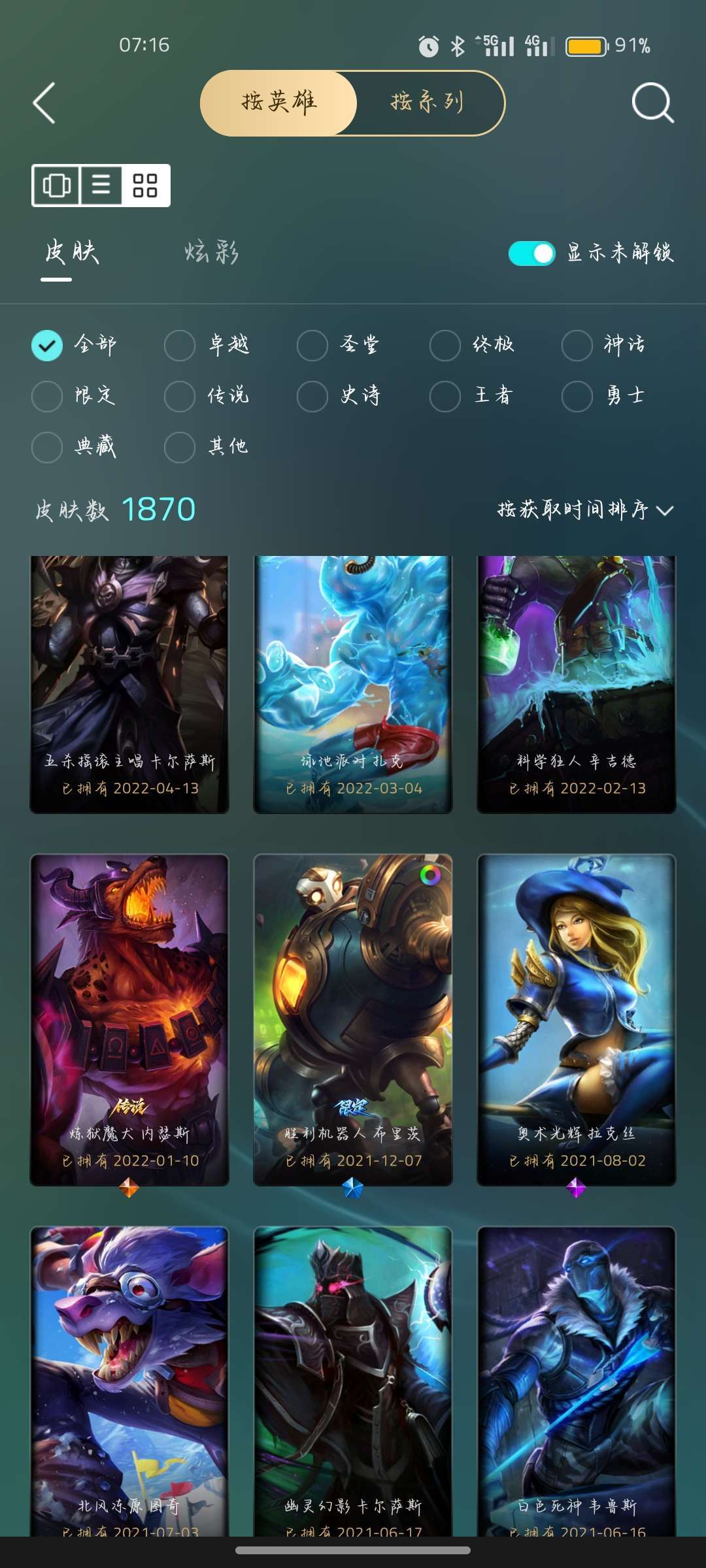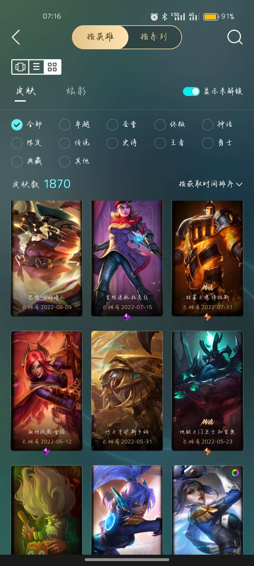 全英雄(可排位)+至臻皮肤+稀有皮肤,至臻海克斯。