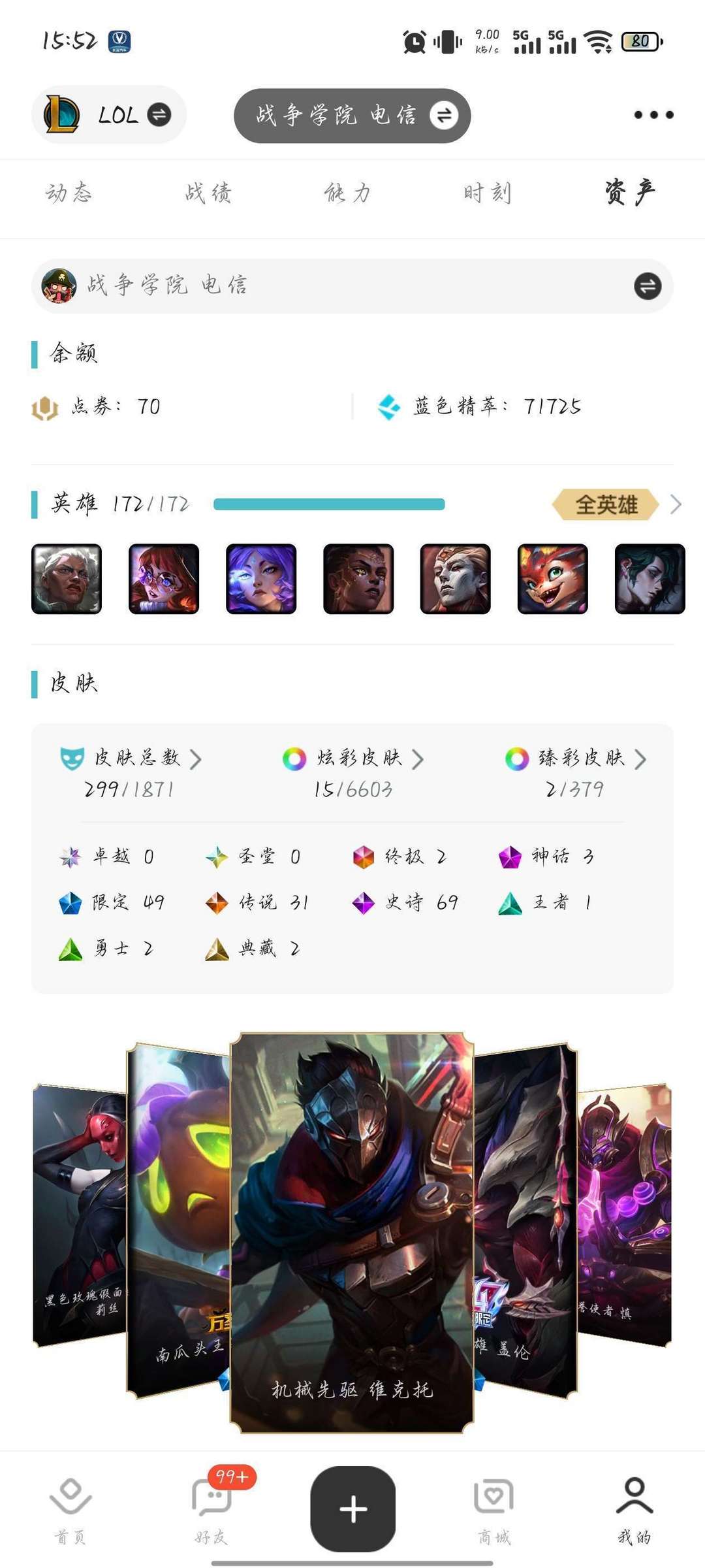 装备描述:英雄172皮肤299,特效皮肤不少,炫彩15,臻彩2