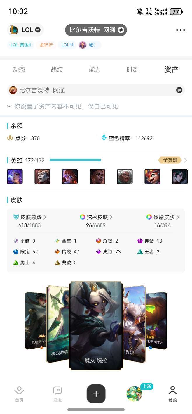 装备描述:全英雄 可排位 600多皮肤 佛耶戈 王 大元素拉克丝 乌迪尔 龙虾等请游戏局内保持文明,防止禁言影响他人游戏,祝您玩得愉快!