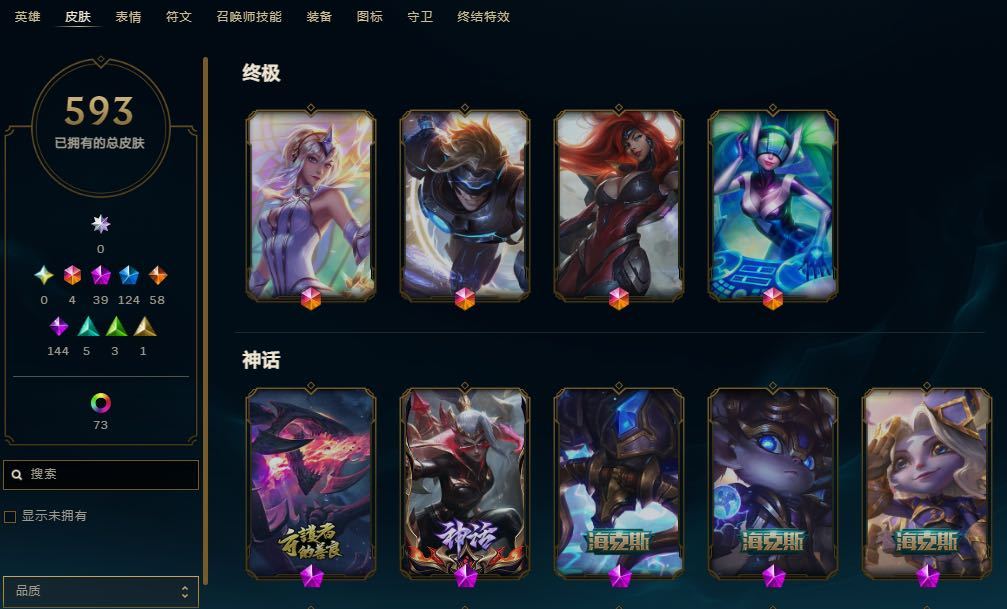 装备描述:总共593皮肤各种金皮神话皮 全英雄基本都有皮肤 至臻非常多 喜欢玩皮肤的可以看一下