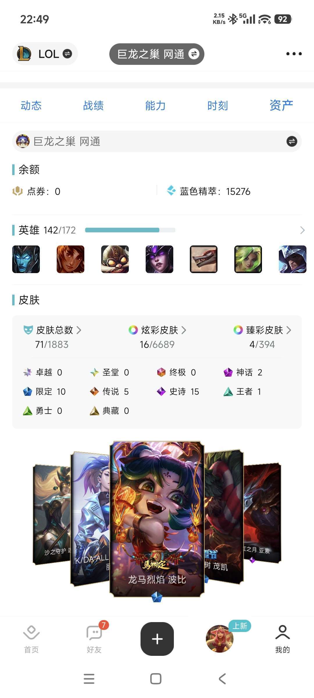 装备描述:就自己娱乐的一个小号,之前70胜率打上钻石后自己掉下来的,后面没咋打排位了