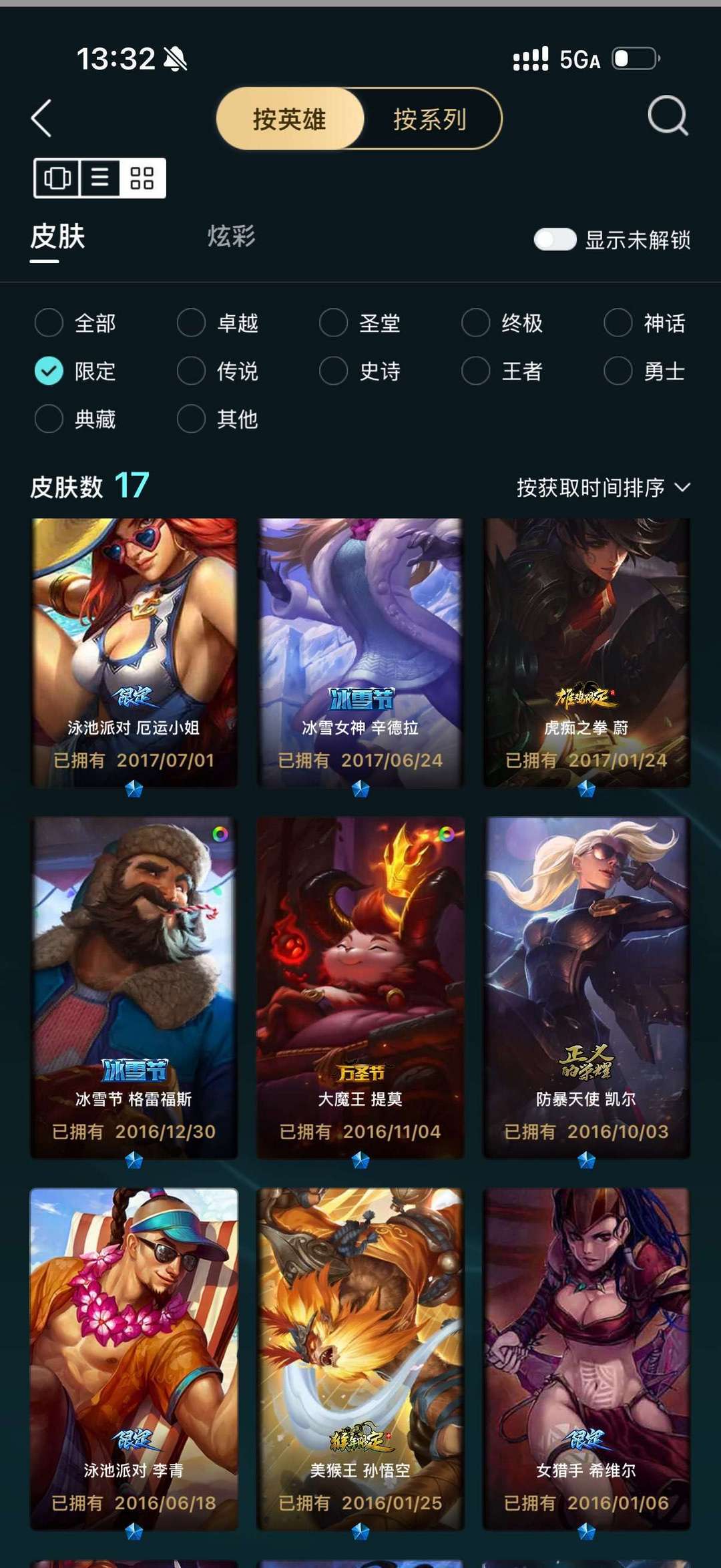 可排位,大元素天使,来战士ez,雄鸡限定,猴年限定,篮钻贵族,17个限定,12个传说,109个皮肤