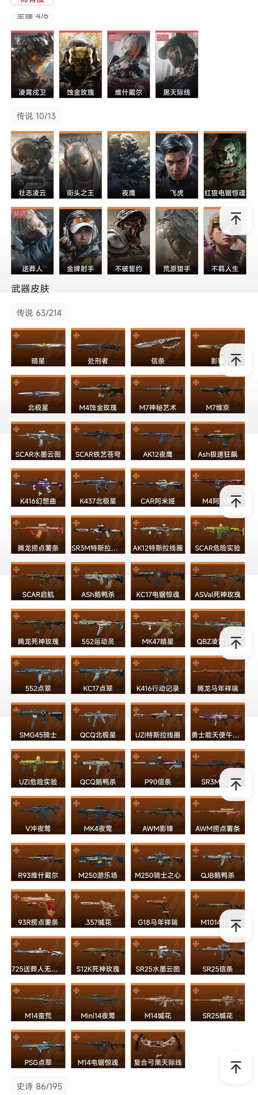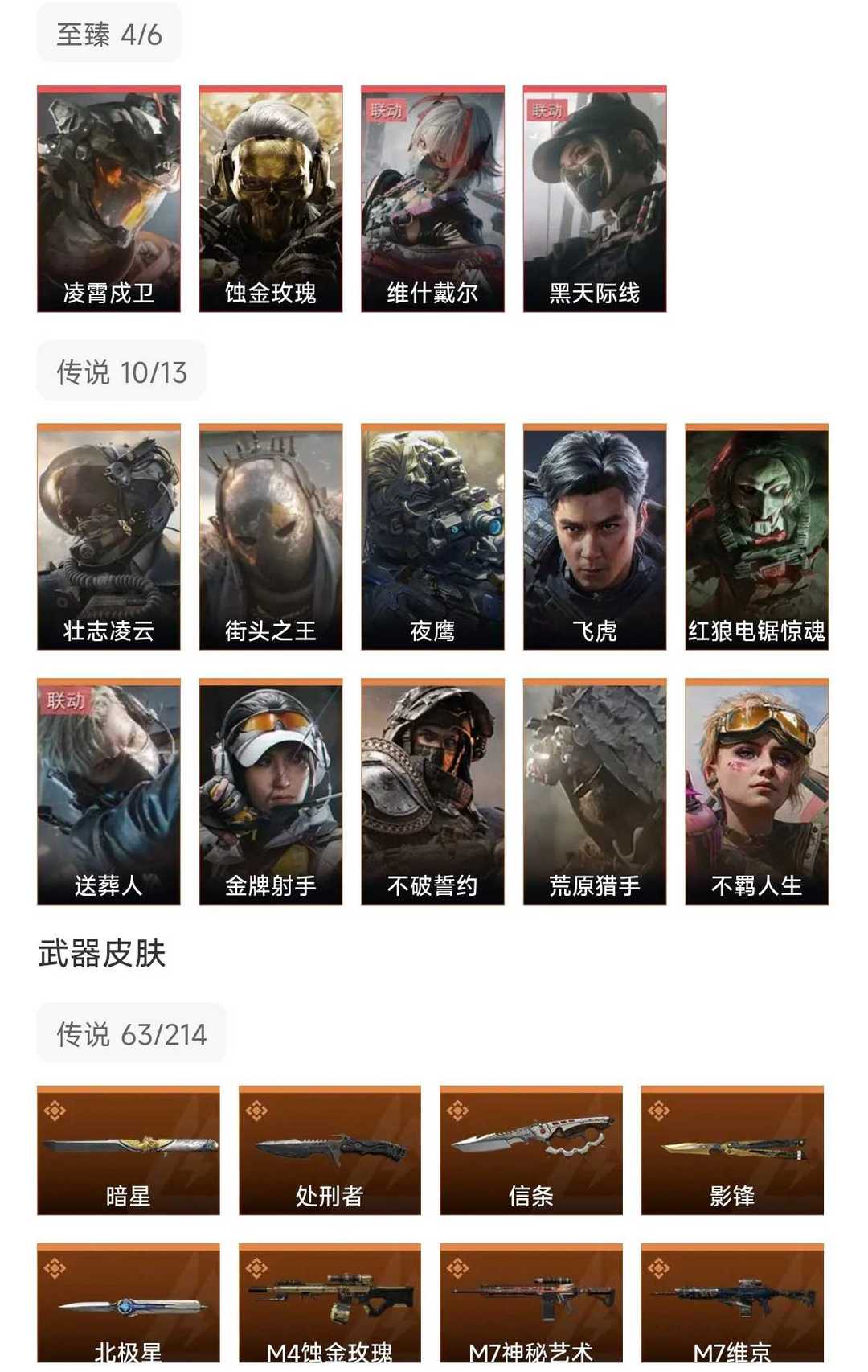 皮肤号 北极星暗星蝴蝶刀信条凌霄戍卫,14干员,蚀金玫瑰维什戴尔,吴彦祖,63款传说枪皮