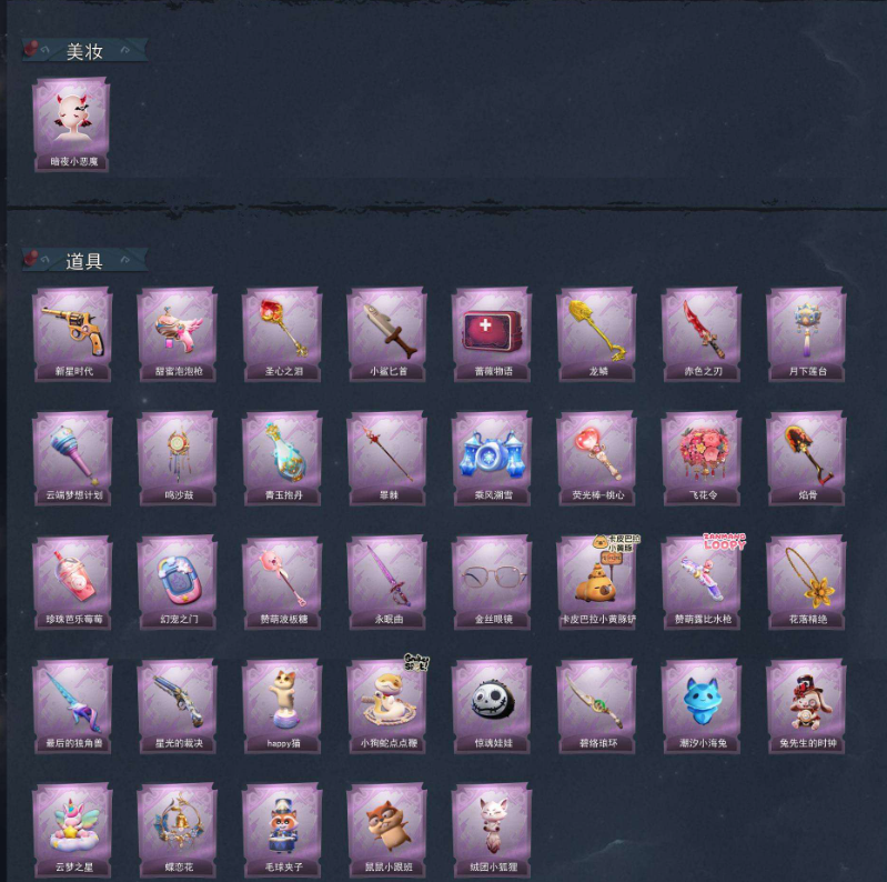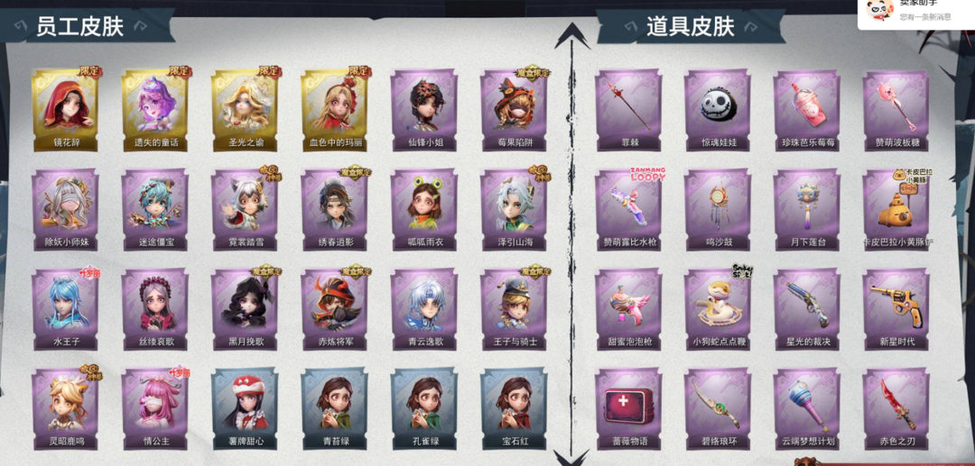 装备描述:【段位】超自然传说 【金色皮肤数量】4 【紫色皮肤数量】16 【道具皮肤数量】34 【累充】27100金砖 【赛季魔盒】稀世豪华魔盒 【员工】小黄、爱丽丝、零、阿念、逍遥、薇薇安、巫铃儿、莉莉、艾伦、爱德华、兰 【金色皮肤】薇薇安-圣光之谕、爱丽丝-血色中的玛丽、小黄-遗失的童话、巫铃儿-镜花辞 【紫色皮肤】薇薇安-仙锋小姐、莉莉-莓果陷阱、阿念-迷途僵宝、莉莉-除妖小师妹、零-赤炼将军、薇薇安-黑月挽歌、阿念-王子与骑士、莉莉-情公主、艾伦-水王子、逍遥-泽引山海、阿念-灵昭鹿鸣、小黄-霓裳踏雪、零-青云逸歌、爱丽丝-丝缕哀歌、逍遥-绣春逍影、小黄-呱呱雨衣 【道具皮肤】转轮手枪-新星时代、电击枪-甜蜜泡泡枪、铲子-圣心之泪、刺刀-小鲨匕首、急救包-蔷薇物语、铲子-龙鳞、刺刀-赤色之刃、腰包-月下莲台、专业手电-云端梦想计划、音响-鸣沙鼓、黄牛能量饮料-青玉抱丹、喷气背包-乘风溯雪、额外的背包-飞花令、铲子-焰骨、黄牛能量饮料-珍珠芭乐莓莓、传送按钮-幻宠之门、铲子-赞萌波板糖、桃木剑-永眠曲、夜视仪-金丝眼镜、铲子-卡皮巴拉小黄豚铲、短管猎枪-赞萌露比水枪、摸金符-花落精绝、桃木剑