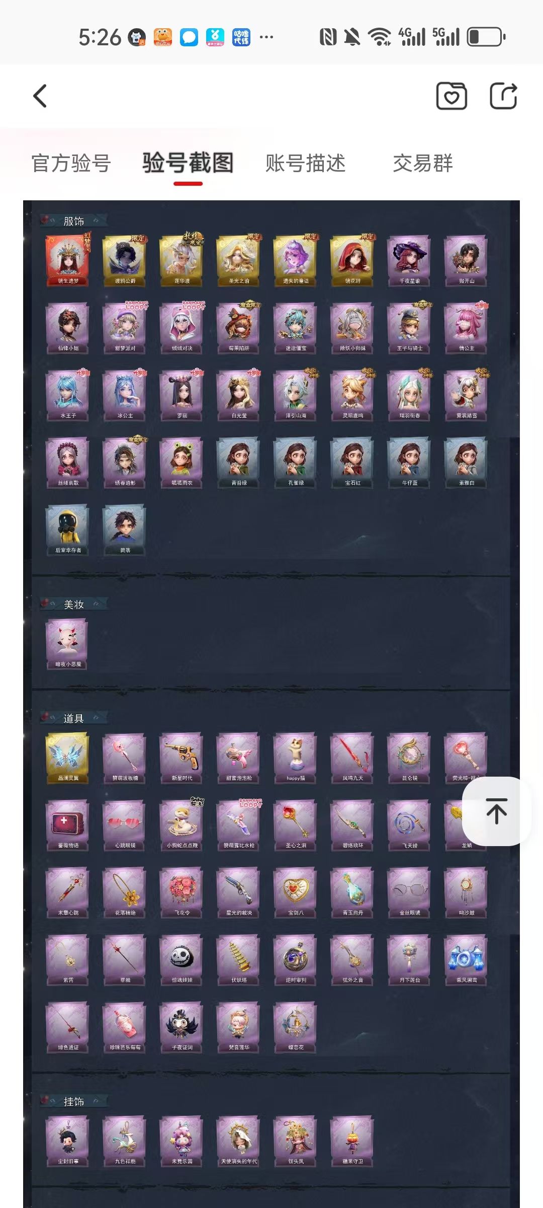 装备描述:【幻梦皮肤】巫铃儿-镜生遗梦 【金色皮肤】零-渡鸦公爵、逍遥-莲华渡、薇薇安-圣光之谕、小黄-遗失的童话、巫铃儿-镜花辞 【紫色皮肤】兰-千夜星谕、零-搬开山、薇薇安-仙锋小姐、爱丽丝-甜梦派对、艾伦-绒绒对决、莉莉-莓果陷阱、阿念-迷途僵宝、莉莉-除妖小师妹、阿念-王子与骑士、莉莉-情公主、艾伦-水王子、爱丽丝-冰公主、小黄-罗丽、薇薇安-白光莹、逍遥-泽引山海、阿念-灵昭鹿鸣、爱丽丝-瑞羽衔春、小黄-霓裳踏雪、爱丽丝-丝缕哀歌、逍遥-绣春逍影、小黄-呱呱雨衣 【道具皮肤】喷气背包-晶澜灵翼、铲子-赞萌波板糖、转轮手枪-新星时代、电击枪-甜蜜泡泡枪、音响-happy猫、桃木剑-凤鸣九天、传送按钮-昆仑镜、急救包-蔷薇物语、夜视仪-心跳眼镜、长鞭-小狗蛇点点鞭、短管猎枪-赞萌露比水枪、铲子-圣心之泪、刺刀-碧络琅环、长鞭-飞天绫、铲子-龙鳞、急救包-末章心跳、摸金符-花落精绝、长鞭-小狗蛇点点鞭、短管猎枪-赞萌露比水枪、铲子-圣心之泪、刺刀-碧络琅环、长鞭-飞天绫 【美妆】暗夜小恶魔