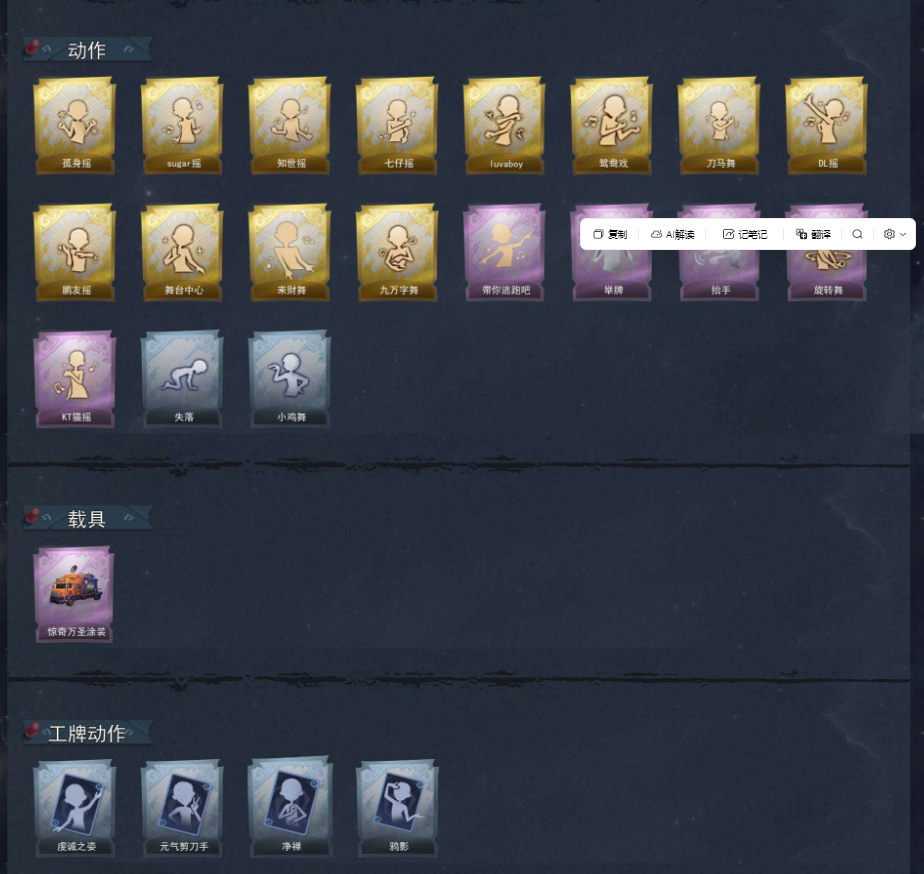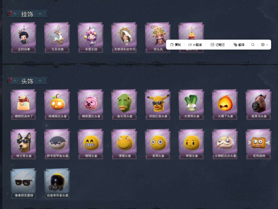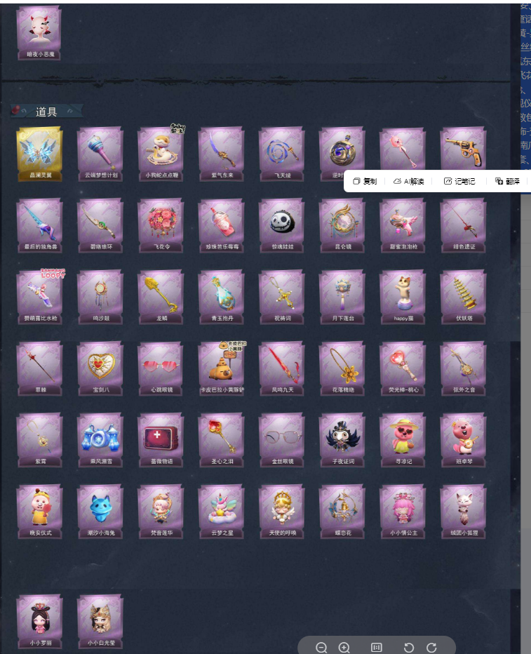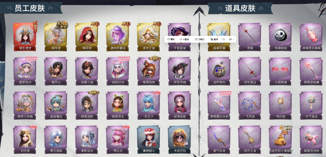 装备描述:【幻梦皮肤数量】1 【金色皮肤数量】4 【紫色皮肤数量】17 【道具皮肤数量】50 【累充】46340金砖 【赛季魔盒】普通魔盒 【员工】小黄、爱丽丝、零、阿念、逍遥、薇薇安、巫铃儿、莉莉、艾伦、爱德华、兰、小满 【幻梦皮肤】巫铃儿-镜生遗梦 【金色皮肤】逍遥-莲华渡、薇薇安-圣光之谕、小黄-遗失的童话、巫铃儿-镜花辞 【紫色皮肤】兰-千夜星谕、零-搬开山、薇薇安-仙锋小姐、爱丽丝-甜梦派对、艾伦-绒绒对决、莉莉-莓果陷阱、小黄-异色序曲、阿念-迷途僵宝、莉莉-除妖小师妹、莉莉-情公主、艾伦-水王子、薇薇安-白光莹、零-青云逸歌、巫铃儿-素影瑶光、爱丽丝-丝缕哀歌、逍遥-绣春逍影、小黄-呱呱雨衣 【道具皮肤】喷气背包-晶澜灵翼、专业手电-云端梦想计划、长鞭-小狗蛇点点鞭、刺刀-紫气东来、长鞭-飞天绫、传送按钮-逆时审判、铲子-赞萌波板糖、转轮手枪-新星时代、桃木剑-最后的独角兽、刺刀-碧络琅环、额外的背包-飞花令、黄牛能量饮料-珍珠芭乐莓莓、腰包-惊魂娃娃、传送按钮-昆仑镜、电击枪-甜蜜泡泡枪、桃木剑-绯色遗证、短管猎枪-赞萌露比水枪、音响-鸣沙鼓、铲子-龙鳞、黄牛能量饮料-青玉抱丹、