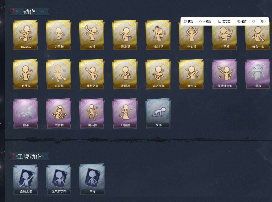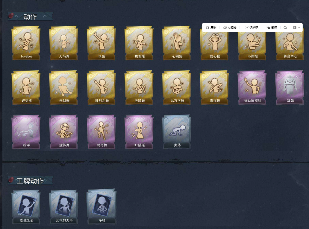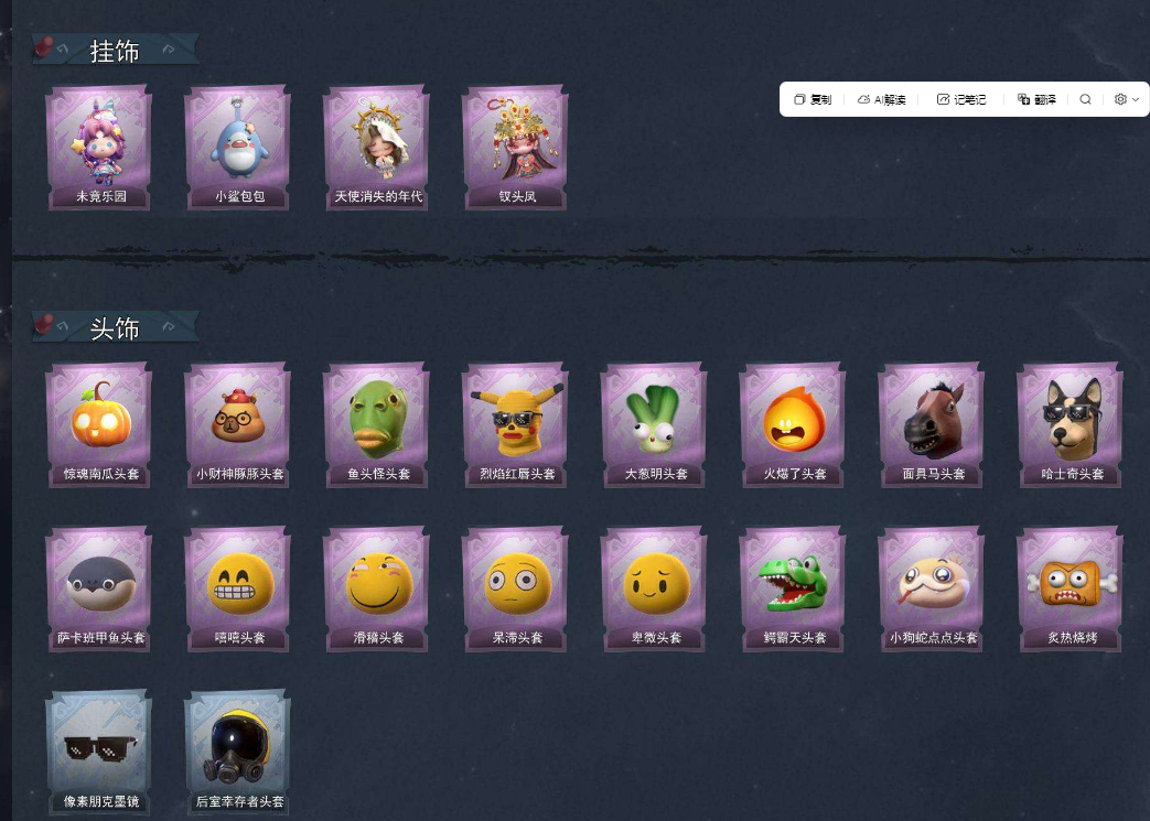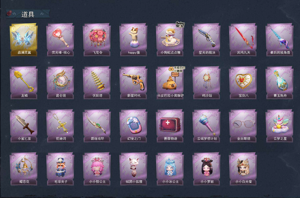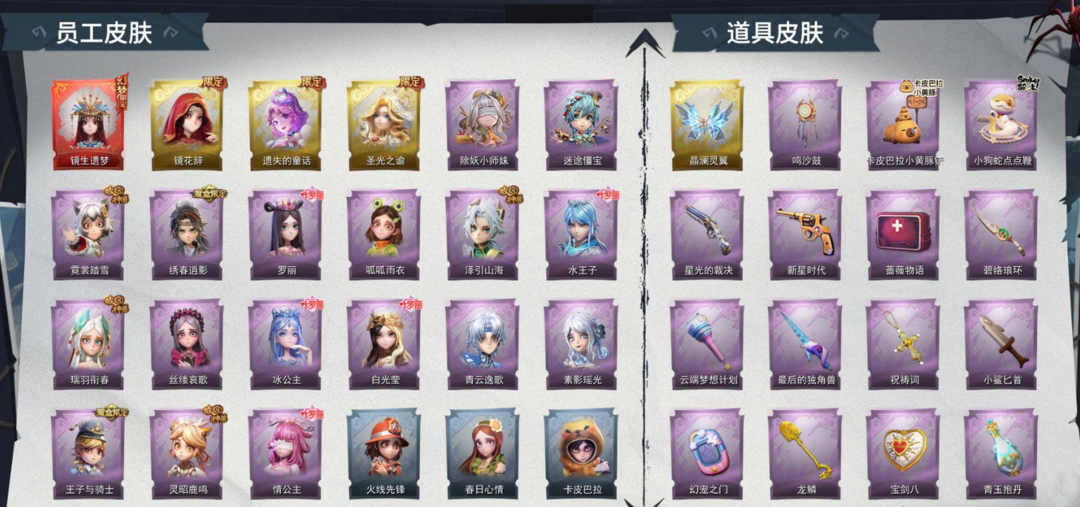 装备描述:【段位】专员 【幻梦皮肤数量】1 【金色皮肤数量】3 【紫色皮肤数量】17 【道具皮肤数量】32 【累充】40940金砖 【赛季魔盒】普通魔盒 【员工】小黄、爱丽丝、零、阿念、逍遥、薇薇安、巫铃儿、莉莉、艾伦、爱德华 【幻梦皮肤】巫铃儿-镜生遗梦 【金色皮肤】薇薇安-圣光之谕、小黄-遗失的童话、巫铃儿-镜花辞 【紫色皮肤】阿念-迷途僵宝、莉莉-除妖小师妹、阿念-王子与骑士、莉莉-情公主、艾伦-水王子、爱丽丝-冰公主、小黄-罗丽、薇薇安-白光莹、逍遥-泽引山海、阿念-灵昭鹿鸣、爱丽丝-瑞羽衔春、小黄-霓裳踏雪、零-青云逸歌、巫铃儿-素影瑶光、爱丽丝-丝缕哀歌、逍遥-绣春逍影、小黄-呱呱雨衣 【道具皮肤】喷气背包-晶澜灵翼、额外的背包-飞花令、音响-happy猫、长鞭-小狗蛇点点鞭、短管猎枪-星光的裁决、桃木剑-凤鸣九天、桃木剑-最后的独角兽、铲子-龙鳞、传送按钮-昆仑镜、葫芦-伏妖塔、转轮手枪-新星时代、铲子-卡皮巴拉小黄豚铲、音响-鸣沙鼓、腰包-宝剑八、黄牛能量饮料-青玉抱丹、腰包-私藏的银河、刺刀-小鲨匕首、摸金符-祝祷词、刺刀-碧络琅环、传送按钮-幻宠之门、急救包-蔷薇物语、专业手
