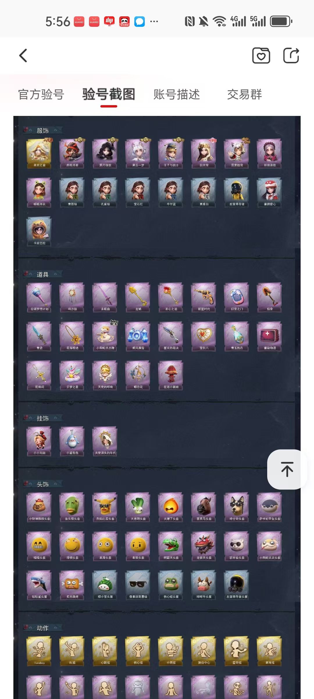 装备描述:【金色皮肤】薇薇安-圣光之谕 【紫色皮肤】零-赤炼将军、薇薇安-黑月挽歌、小黄-青丘一梦、阿念-王子与骑士、薇薇安-白光莹、小黄-霓裳踏雪、爱丽丝-丝缕哀歌、小黄-呱呱雨衣 【道具皮肤】专业手电-云端梦想计划、音响-鸣沙鼓、桃木剑-永眠曲、铲子-龙鳞、铲子-圣心之泪、转轮手枪-新星时代、传送按钮-幻宠之门、铲子-焰骨、刺刀-青瓷、摸金符-花落精绝、长鞭-小狗蛇点点鞭、喷气背包-乘风溯雪、短管猎枪-星光的裁决、腰包-宝剑八、黄牛能量饮料-青玉抱丹、急救包-蔷薇物语、摸金符-祝祷词、背饰-云梦之星、背饰-天使的呼唤、背饰-蝶恋花、背饰-在逃小新娘 【头饰】小财神豚豚头套、鱼头怪头套、烈焰红唇头套、大葱明头套、火爆了头套、面具马头套、哈士奇头套、萨卡班甲鱼头套、嘻嘻头套、滑稽头套、呆滞头套、卑微头套、鳄霸天头套、龙傲天头套、驼半仙头套、小狗蛇点点头套、咬咬鲨头套、炙热烧烤、粽小宝头套、像素朋克墨镜、伤心蛙头套、哞哞牛头套、后室幸存者头套 【挂饰】小小玛丽、小鲨包包、天使消失的年代