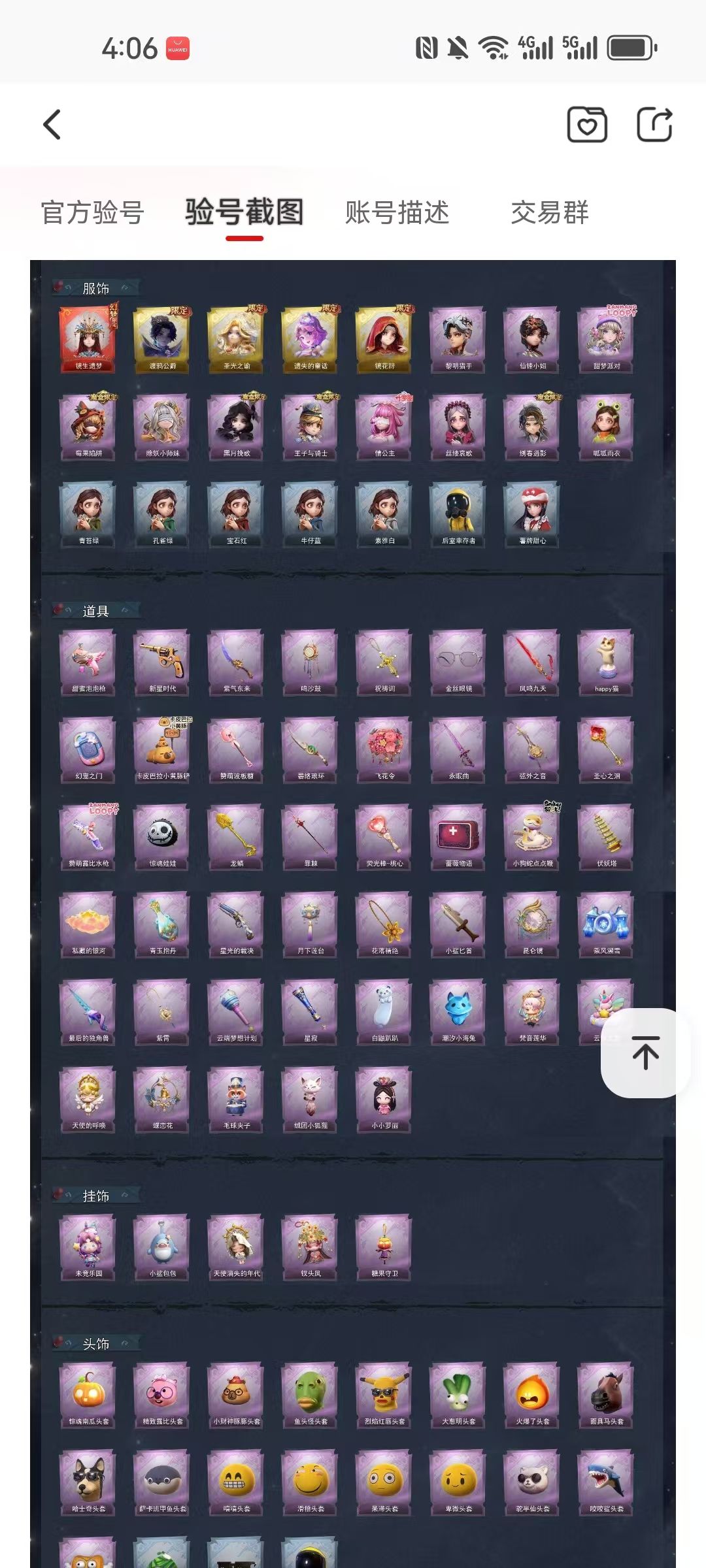 装备描述:【幻梦皮肤】巫铃儿-镜生遗梦3金 【金色皮肤】零-渡鸦公爵、薇薇安-圣光之谕、小黄-遗失的童话、巫铃儿-镜花辞 【紫色皮肤】艾伦-黎明猎手、薇薇安-仙锋小姐、爱丽丝-甜梦派对、莉莉-莓果陷阱、莉莉-除妖小师妹、薇薇安-黑月挽歌、阿念-王子与骑士、莉莉-情公主、爱丽丝-丝缕哀歌、逍遥-绣春逍影、小黄-呱呱雨衣 【道具皮肤】电击枪-甜蜜泡泡枪、转轮手枪-新星时代、刺刀-紫气东来、音响-鸣沙鼓、摸金符-祝祷词、夜视仪-金丝眼镜、桃木剑-凤鸣九天、音响-happy猫、传送按钮-幻宠之门、铲子-卡皮巴拉小黄豚铲、铲子-赞萌波板糖、刺刀-碧络琅环、额外的背包-飞花令、桃木剑-永眠曲、除颤仪-弦外之音、铲子-圣心之泪、短管猎枪-赞萌露比水枪、腰包-惊魂娃娃、铲子-龙鳞、急救包-蔷薇物语、长鞭-小狗蛇点点鞭、葫芦-伏妖塔、腰包-私藏的银河、黄牛能量饮料-青玉抱丹、短管猎枪-星光的裁决、腰包-月下莲台、摸金符-花落精绝、刺刀-小鲨匕首、传送按钮-昆仑镜、喷气背包-乘风溯雪、桃木剑-最后的独角兽、摸金符-紫霄、专业手电-云端梦想计划、专业手电-星寂、背饰-白鼬趴趴、背饰-潮汐小海兔【载具】惊奇万圣涂装