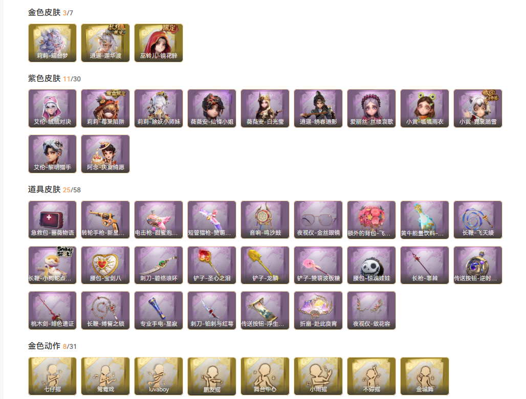 限制: 租号3次及以上 |装备描述:皮肤:逍遥-莲华渡,莉莉-瑶台梦,巫铃儿-镜花辞,艾伦-绒绒对决,小黄-呱呱雨衣,莉莉-莓果陷阱,逍遥-绣春逍影,艾伦-黎明猎手,阿念-庆宴绮愿,爱丽丝-丝缕哀歌,薇薇安-白光莹,小黄-霓裳踏雪,薇薇安-仙锋小姐,莉莉-除妖小师妹;道具:传送按钮-逆时审判,长鞭-小狗蛇点点鞭,长鞭-飞天绫,转轮手枪-新星时代,腰包-宝剑八,短管猎枪-赞萌露比水枪,额外的背包-飞花令,黄牛能量饮料-青玉抱丹,桃木剑-绯色遗证,夜视仪-金丝眼镜,腰包-惊魂娃娃,急救包-蔷薇物语,折扇-赴此良宵,闪光弹-金戈玄铜,长枪-罪棘,夜视仪-敛花容,刺刀-铂刺与红萼,铲子-圣心之泪,音响-鸣沙鼓,电击枪-甜蜜泡泡枪,长鞭-缚誓之锁,刺刀-碧络琅环,专业手电-星寂,铲子-龙鳞,铲子-赞萌波板糖,传送按钮-浮生一梦;饰品:头饰-卑微头套,头饰-精致露比头套,头饰-滑稽头套,头饰-,头饰-惊魂南瓜头套,头饰-烈焰红唇头套,头饰-雪墩墩头套,头饰-嘻嘻头套,头饰-蒜了八,头饰-大葱明头套,头饰-小狗蛇点点头套,头饰-太空鲨头套,头饰-面具马头套,头饰-鱼头怪头套,头饰-炙热烧烤,头饰-樱桃奶油布丁,头饰-萨卡班甲鱼
