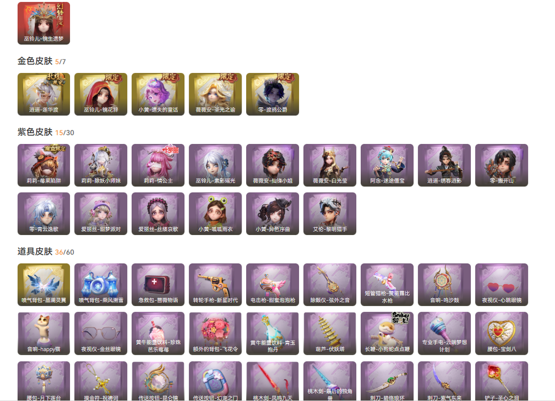 限制: 租号3次及以上 |装备描述:皮肤:巫铃儿-镜生遗梦,巫铃儿-镜花辞,小黄-遗失的童话,薇薇安-圣光之谕,零-渡鸦公爵,逍遥-莲华渡,莉莉-除妖小师妹,逍遥-绣春逍影,爱丽丝-甜梦派对,艾伦-黎明猎手,爱丽丝-丝缕哀歌,小黄-异色序曲,零-搬开山,薇薇安-白光莹,零-青云逸歌,小黄-呱呱雨衣,莉莉-情公主,巫铃儿-素影瑶光,阿念-迷途僵宝,薇薇安-仙锋小姐,莉莉-莓果陷阱;道具:喷气背包-晶澜灵翼,音响-happy猫,黄牛能量饮料-珍珠芭乐莓莓,葫芦-伏妖塔,铲子-圣心之泪,刺刀-碧络琅环,黄牛能量饮料-青玉抱丹,传送按钮-逆时审判,刺刀-紫气东来,长枪-罪棘,桃木剑-最后的独角兽,长鞭-小狗蛇点点鞭,音响-鸣沙鼓,电击枪-甜蜜泡泡枪,除颤仪-弦外之音,专业手电-云端梦想计划,桃木剑-凤鸣九天,传送按钮-幻宠之门,桃木剑-绯色遗证,额外的背包-飞花令,急救包-末章心跳,传送按钮-昆仑镜,短管猎枪-赞萌露比水枪,摸金符-祝祷词,腰包-月下莲台,专业手电-星寂,转轮手枪-新星时代,腰包-宝剑八,夜视仪-心跳眼镜,急救包-蔷薇物语,铲子-赞萌波板糖,音响-冬夜暖忆,喷气背包-乘风溯雪,腰包-私藏的银河,夜视仪-金丝眼镜,