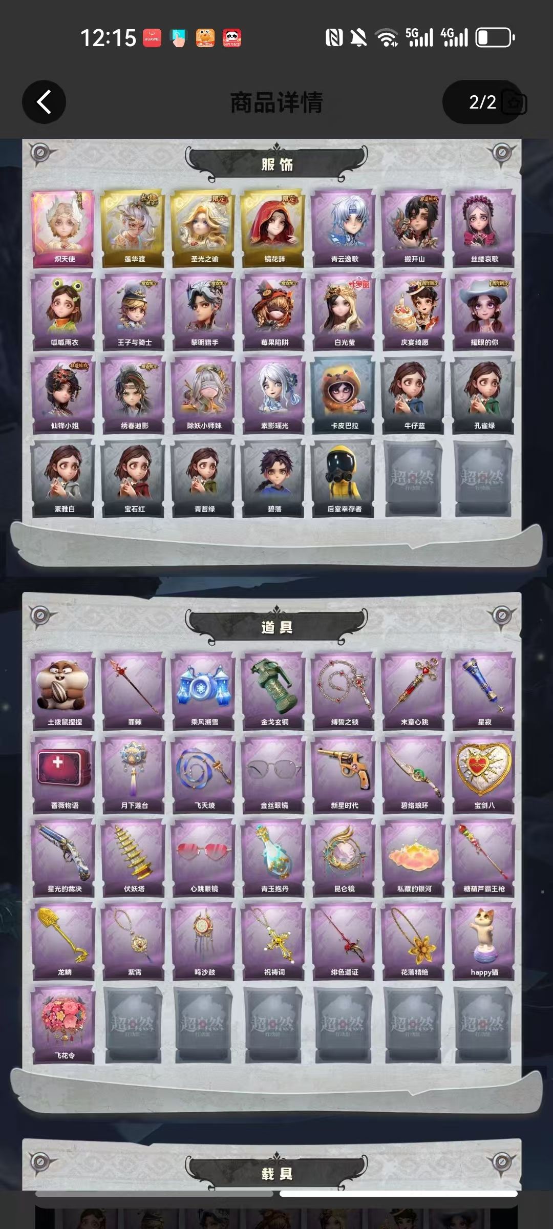 装备描述:皮肤:小黄-炽天使,逍遥-莲华渡,薇薇安-圣光之谕,巫铃儿-镜花辞,零-青云逸歌,零-搬开山,爱丽丝-丝缕哀歌,小黄-呱呱雨衣,阿念-王子与骑士,艾伦-黎明猎手,莉莉-莓果陷阱,薇薇安-白光莹,阿念-庆宴绮愿,爱丽丝-耀眼的你,薇薇安-仙锋小姐,逍遥-绣春逍影,莉莉-除妖小师妹,巫铃儿-素影瑶光;道具:急救包-土拨鼠捏捏,长枪-罪棘,喷气背包-乘风溯雪,闪光弹-金戈玄铜,长鞭-缚誓之锁,急救包-末章心跳,专业手电-星寂,急救包-蔷薇物语,腰包-月下莲台,长鞭-飞天绫,夜视仪-金丝眼镜,转轮手枪-新星时代,刺刀-碧络琅环,腰包-宝剑八,短管猎枪-星光的裁决,葫芦-伏妖塔,夜视仪-心跳眼镜,黄牛能量饮料-青玉抱丹,传送按钮-昆仑镜,腰包-私藏的银河,长枪-糖葫芦霸王枪,铲子-龙鳞,摸金符-紫霄,音响-鸣沙鼓,摸金符-祝祷词,桃木剑-绯色遗证,摸金符-花落精绝,音响-happy猫,额外的背包-飞花令;