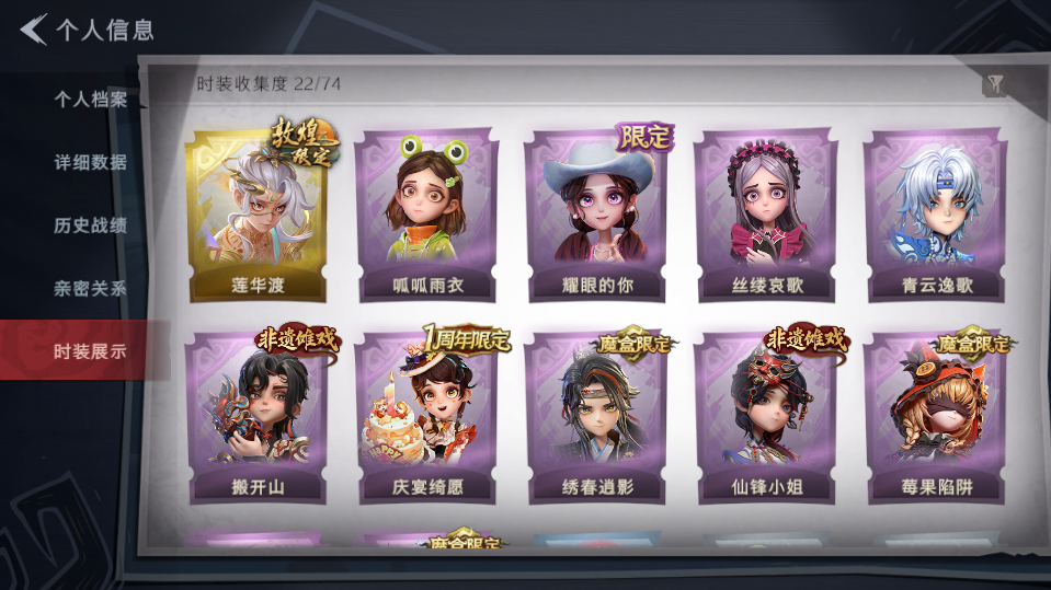 装备描述:逍遥-莲华渡 薇薇安-仙锋小姐 莉莉-莓果陷阱 艾伦-黎明猎手 小黄-呱呱雨衣 爱丽丝-丝缕哀歌 零-青云逸歌 零-搬开山 逍遥-绣春逍影 莉莉-除妖小师妹 阿念-庆宴绮愿 爱丽丝-耀眼的你 长枪-罪棘 长鞭-缚誓之锁 传送按钮-逆时审判 腰包-月下莲台 额外的背包-飞花令 摸金符-花落精绝 夜视仪-金丝眼镜 专业手电-星寂 急救包-末章心跳 刺刀-碧络琅环 音响-鸣沙鼓 急救包-蔷薇物语 转轮手枪-新星时代 喷气背包