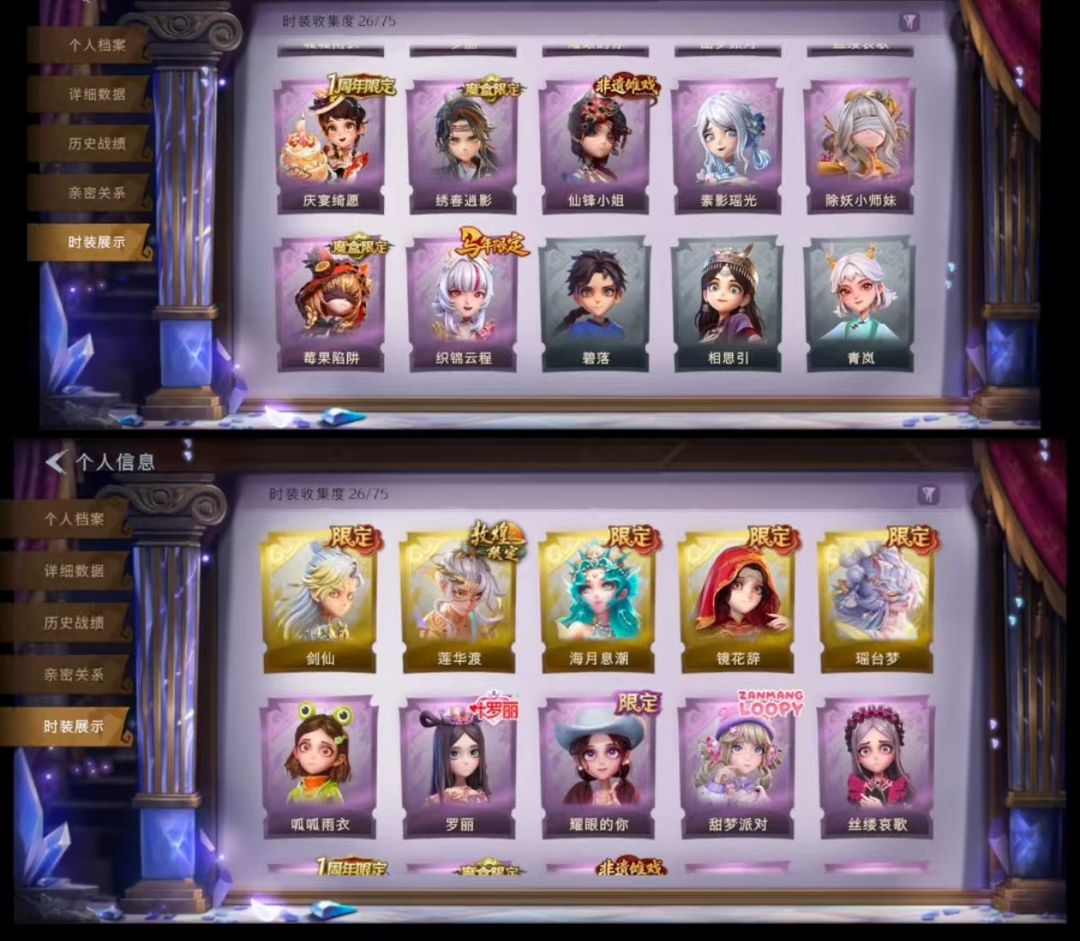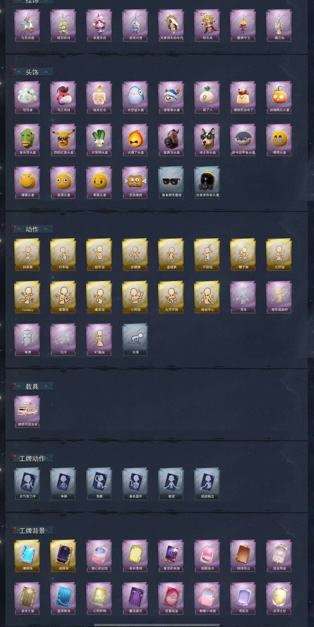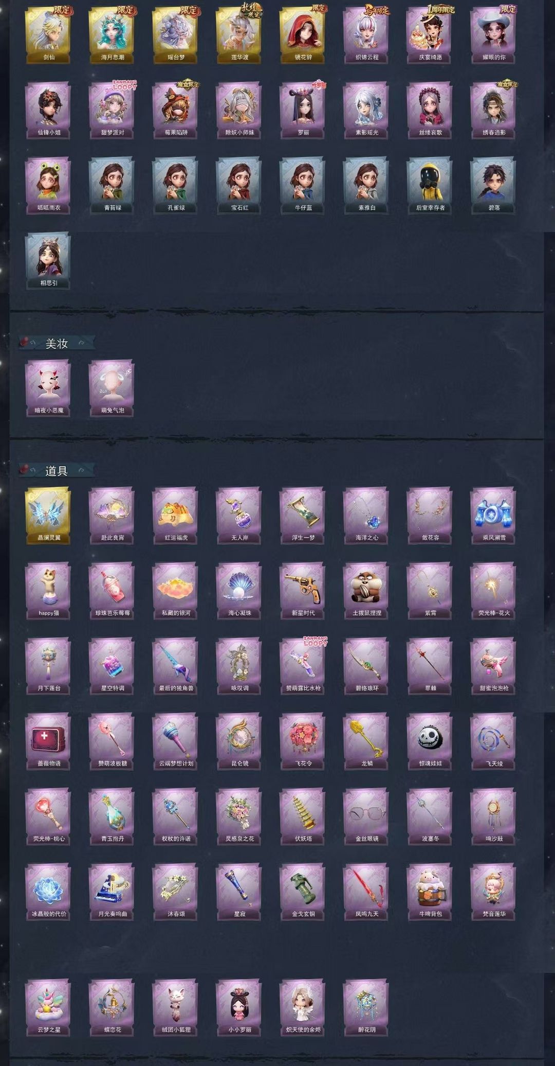 装备描述:[金色皮肤]逍遥-剑仙 薇薇安-海月息潮 莉莉-瑶台梦 逍遥-莲华渡 巫铃儿-镜花辞 [紫色皮肤]临云-织锦云程 阿念-庆宴绮愿 爱丽丝-耀眼的你 薇薇安-仙锋小姐 爱丽丝-甜梦派对 莉莉-莓果陷阱 莉莉-除妖小师妹 小黄-罗丽 巫铃儿-素影瑶光 爱丽丝-丝缕哀歌 逍遥-绣春逍影 小黄-呱呱雨衣 [道具皮肤]喷气背包-晶澜灵翼 折扇-赴此良宵 腰包-红运福虎 黄牛能量饮料-无人岸 传送按钮-浮生一梦 摸金符-海洋之心 夜视仪-花容 喷气背包-乘风溯雪 音响-happy猫 黄牛能量饮料-珍珠芭乐莓莓 腰包-私藏的银河 葫芦-海心凝珠 转轮手枪-新星时代 急救包-土拨鼠捏捏 摸金符-紫霄 腰包-月下莲台 黄牛能量饮料-星空特调 桃木剑-最后的独角兽 音响-咏叹调 短管猎枪-赞萌露比水枪 刺刀-碧络琅环 电击枪-甜蜜泡泡枪 急救包-蔷薇物语 铲子-赞萌波板糖 专业手电-云端梦想计划 传送按钮-昆仑镜 额外的背包-飞花令 铲子-龙鳞 腰包-惊魂娃娃 长鞭-飞天绫 黄牛能量饮料-青玉抱丹 电击枪-权杖的许诺 额外的背包-灵感泉之花 葫芦-伏妖塔 夜视仪-金丝眼镜 长枪-波塞冬 音响-鸣沙鼓 除额
