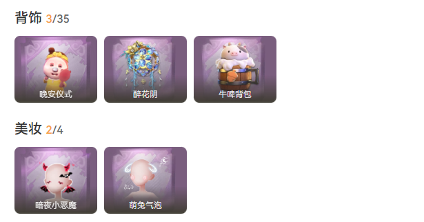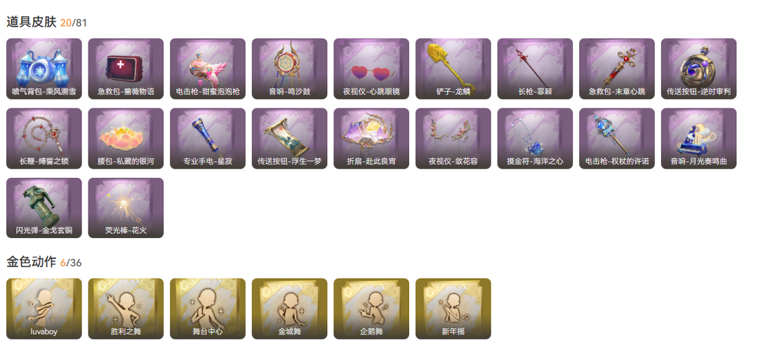 装备描述:金皮1;紫皮10;道具皮21;皮肤:莉莉-瑶台梦,薇薇安-仙锋小姐,艾伦-黎明猎手,莉莉-莓果陷阱,小黄-呱呱雨衣,爱丽丝-耀眼的你,莉莉-除妖小师妹,莉莉-情公主,爱丽丝-甜梦派对,薇薇安-白光莹,阿念-庆宴绮愿;道具:急救包-末章心跳,电击枪-权杖的许诺,急救包-蔷薇物语,喷气背包-乘风溯雪,闪光弹-金戈玄铜,铲子-龙鳞,夜视仪-心跳眼镜,音响-鸣沙鼓,荧光棒-花火-荧光棒-花火,摸金符-海洋之心,折扇-赴此良宵,长鞭-缚誓之锁,音响-月光奏鸣曲,传送按钮-逆时审判,电击枪-甜蜜泡泡枪,长枪-罪棘,腰包-私藏的银河,夜视仪-敛花容,专业手电-星寂,传送按钮-浮生一梦,伞-伞;美妆:美妆-暗夜小恶魔,美妆-萌兔气泡;饰品:头饰-卑微头套,头饰-萨卡班甲鱼头套,头饰-嘻嘻头套,头饰-太空鲨头套,头饰-滑稽头套,头饰-呆滞头套,头饰-面具马头套,头饰-哈士奇头套,头饰-烛光,头饰-大葱明头套,头饰-鱼头怪头套,头饰-蒜了八,头饰-樱桃奶油布丁,头饰-惊魂南瓜头套,头饰-马上有钱,头饰-烈焰红唇头套,头饰-雪墩墩头套,头饰-饺饺者头套,头饰-火爆了头套,头饰-精致露比头套,头饰-像素朋