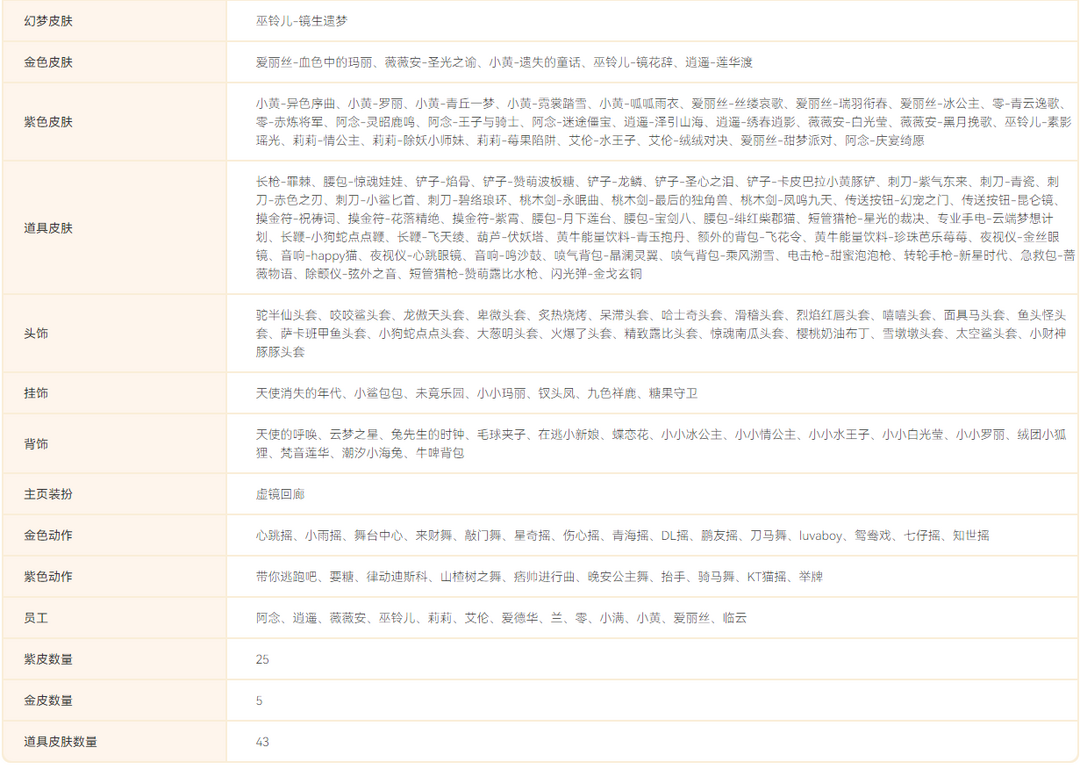 限制: 撤单率<30%才可租用此帐号装备描述:1幻梦5耀世 1红5金25紫1车皮 晶澜灵翼 惊奇万圣涂装车皮 镜生遗梦 血色中的玛丽 圣光之谕、小黄-遗失的童话、巫铃儿-镜花辞、逍遥-莲华渡 小黄-异色序曲、小黄-罗丽、小黄-青丘一梦、小黄-霓裳踏雪、小黄-呱呱雨衣、爱丽丝-丝缕哀歌、爱丽丝-瑞羽衔春、爱丽丝-冰公主、零-青云逸歌、零-赤炼将军、阿念-灵昭鹿鸣、阿念-王子与骑士、阿念-迷途僵宝、逍遥-泽引山海、逍遥-绣春逍影、薇薇安-白光莹、薇薇安-黑月挽歌、巫铃儿-素影瑶光、莉莉-情公主、莉莉-除妖小师妹、莉莉-莓果陷阱、艾伦-水王子、艾伦-绒绒对决、爱丽丝-甜梦派对、阿念-庆宴绮愿 长枪-罪棘、腰包-惊魂娃娃、铲子-焰骨、铲子-赞萌波板糖、铲子-龙鳞、铲子-圣心之泪、铲子-卡皮巴拉小黄豚铲、刺刀-紫气东来、刺刀-青瓷、刺刀-赤色之刃、刺刀-小鲨匕首、刺刀-碧络琅环、桃木剑-永眠曲、桃木剑-最后的独角兽、桃木剑-凤鸣九天、传送按钮-幻宠之门、传送按钮-昆仑镜、摸金符-祝祷词、摸金符-花落精绝、摸金符-紫霄、腰包-月下莲台、腰包-宝剑八、腰包-绯红柴郡猫、短管猎枪-星光的裁决、专业手电-云端梦想计划、长鞭-小狗蛇点点鞭、长鞭-飞天