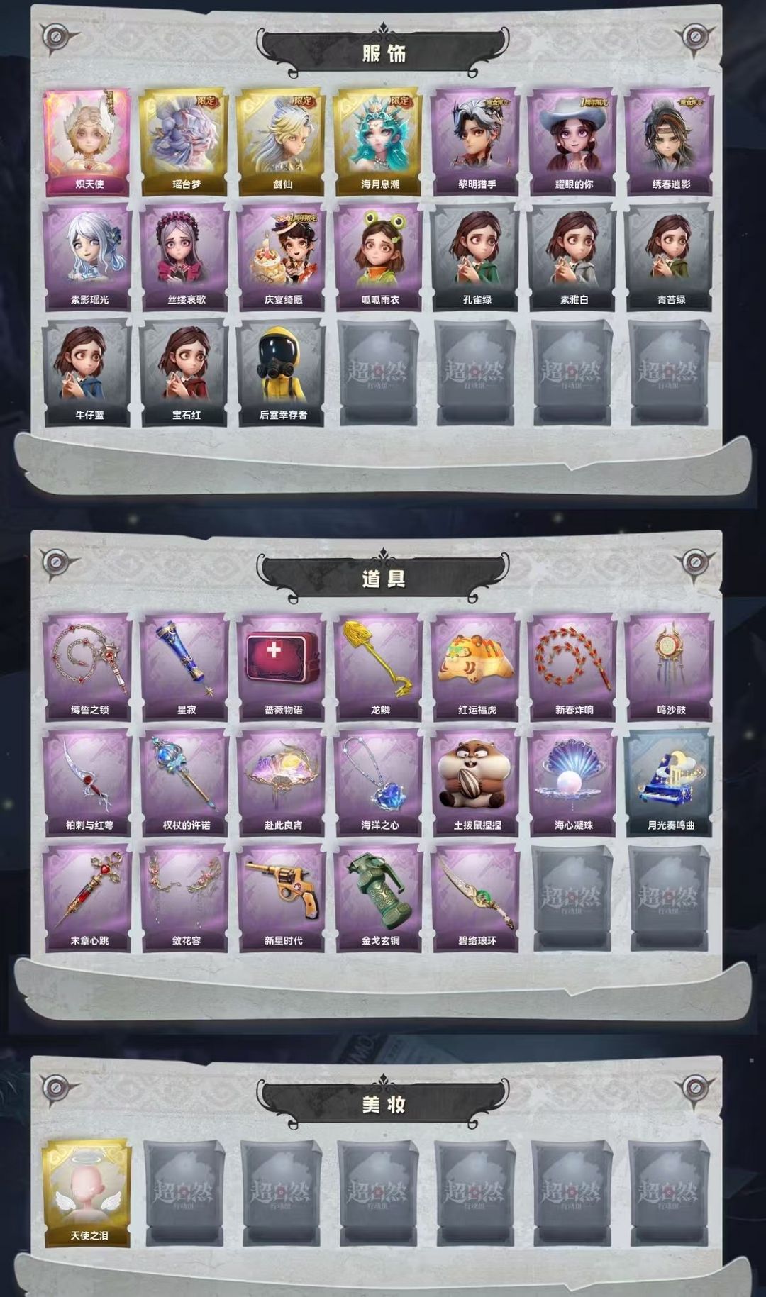装备描述:粉皮1;金皮3;紫皮7;道具皮19; 皮肤:小黄-炽天使,莉莉-瑶台梦,逍遥-剑仙,薇薇安-海月息潮,艾伦-黎明猎手,爱丽丝-耀眼的你,逍遥-绣春逍影,巫铃儿-素影瑶光,爱丽丝-丝缕哀歌,阿念-庆宴绮愿,小黄-呱呱雨衣; 道具:长鞭-缚誓之锁,专业手电-星寂,急救包-蔷薇物语,铲子-龙鳞,腰包-红运福虎,长鞭-新春炸响,音响-鸣沙鼓,刺刀-铂刺与红萼,电击枪-权杖的许诺,折扇-赴此良宵,摸金符-海洋之心,急救包-土拨鼠捏捏,葫芦-海心凝珠,音响-月光奏鸣曲,急救包-末章心跳,转轮手枪-新星时代,闪光弹-金戈玄铜,刺刀-碧络琅环; 美妆:美妆-天使之泪; 饰品:头饰-烈焰红唇头套,头饰-呆滞头套,头饰-滑稽头套,头饰-火爆了头套,头饰-嘻嘻头套,头饰-萨卡班甲鱼头套,头饰-蒜了八,头饰-面具马头套,头饰-卑微头套,头饰-惊魂南瓜头套,头饰-大葱明头套,头饰-鱼头怪头套,头饰-炙热烧烤,头饰-饺饺者头套,头饰-鳄霸天头套,头饰-马上有钱,头饰-哈士奇头套,头饰-像素朋克墨镜,头饰-后室幸存者头套,挂饰-孤独对望,挂饰-桂冠聆诗,挂饰-钗头凤,挂饰-晚安小熊,挂饰-小鲨包包,挂饰-不朽的今夜
